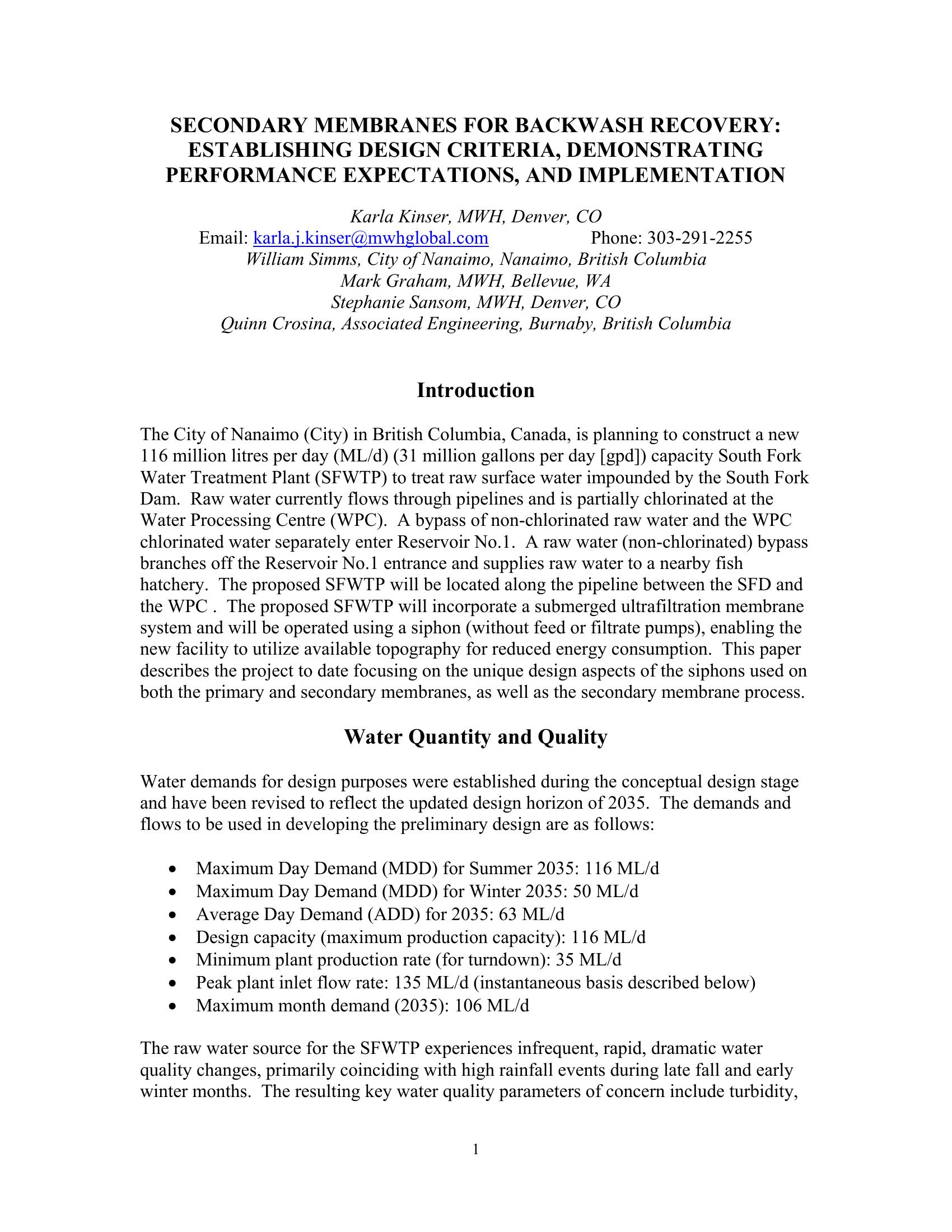 SECONDARY MEMBRANES FOR BACKWASH RECOVERY: ESTABLISHING DESIGN CRITERIA, DEMONSTRATING PERFORMANCE EXPECTATIONS, AND IMPLEMENTATION. The proposed SFWTP will incorporate a submerged ultrafiltration membrane system and will be operated using a siphon (without feed or filtrate pumps), enabling the new facility to utilize available topography for reduced energy consumption. This paper describes the project to date focusing on the unique design aspects of the siphons used on both the primary and secondary membranes, as well as the secondary membrane process.
