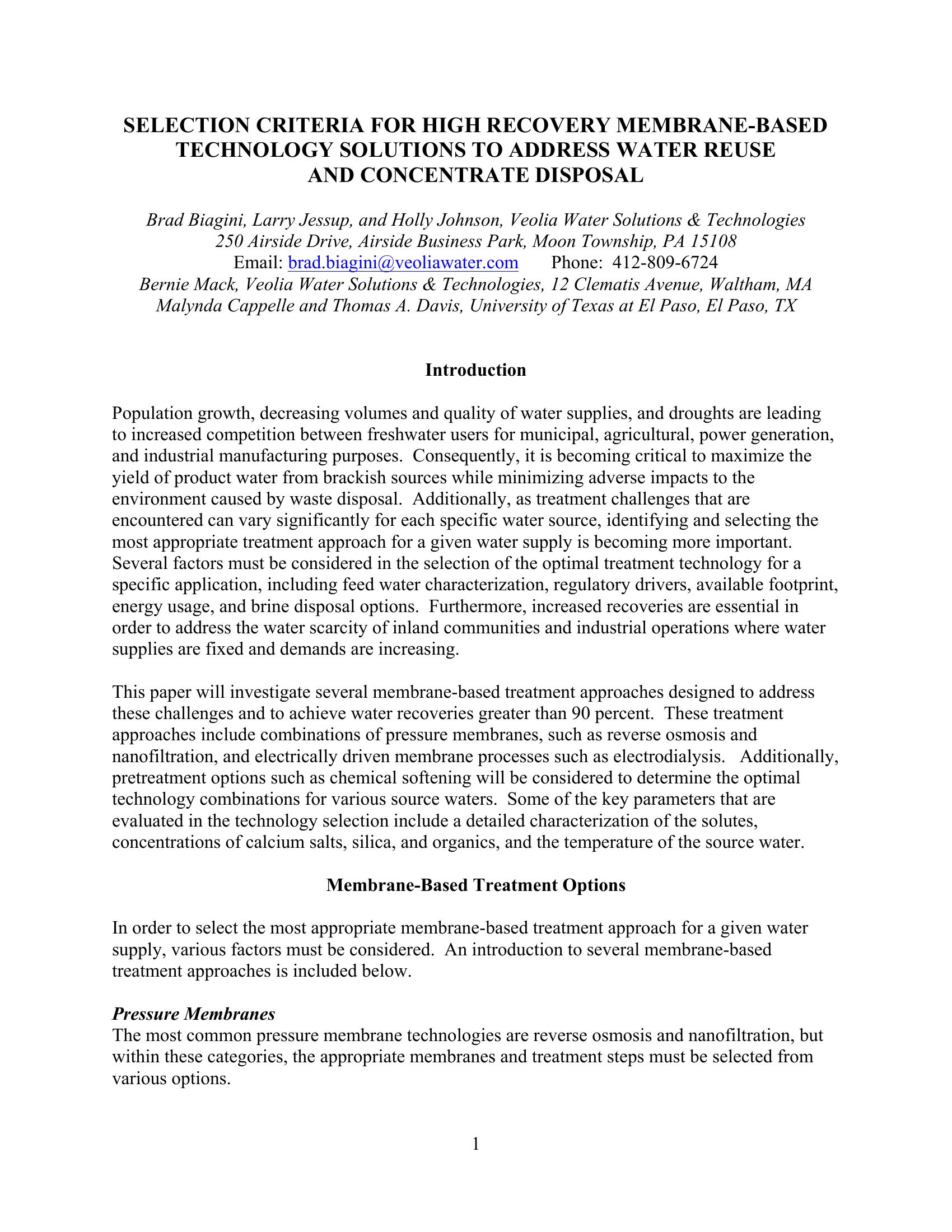 Selection Criteria for High Recovery Membrane-Based Technology Solutions to Address Water Reuse and Concentrate Disposal