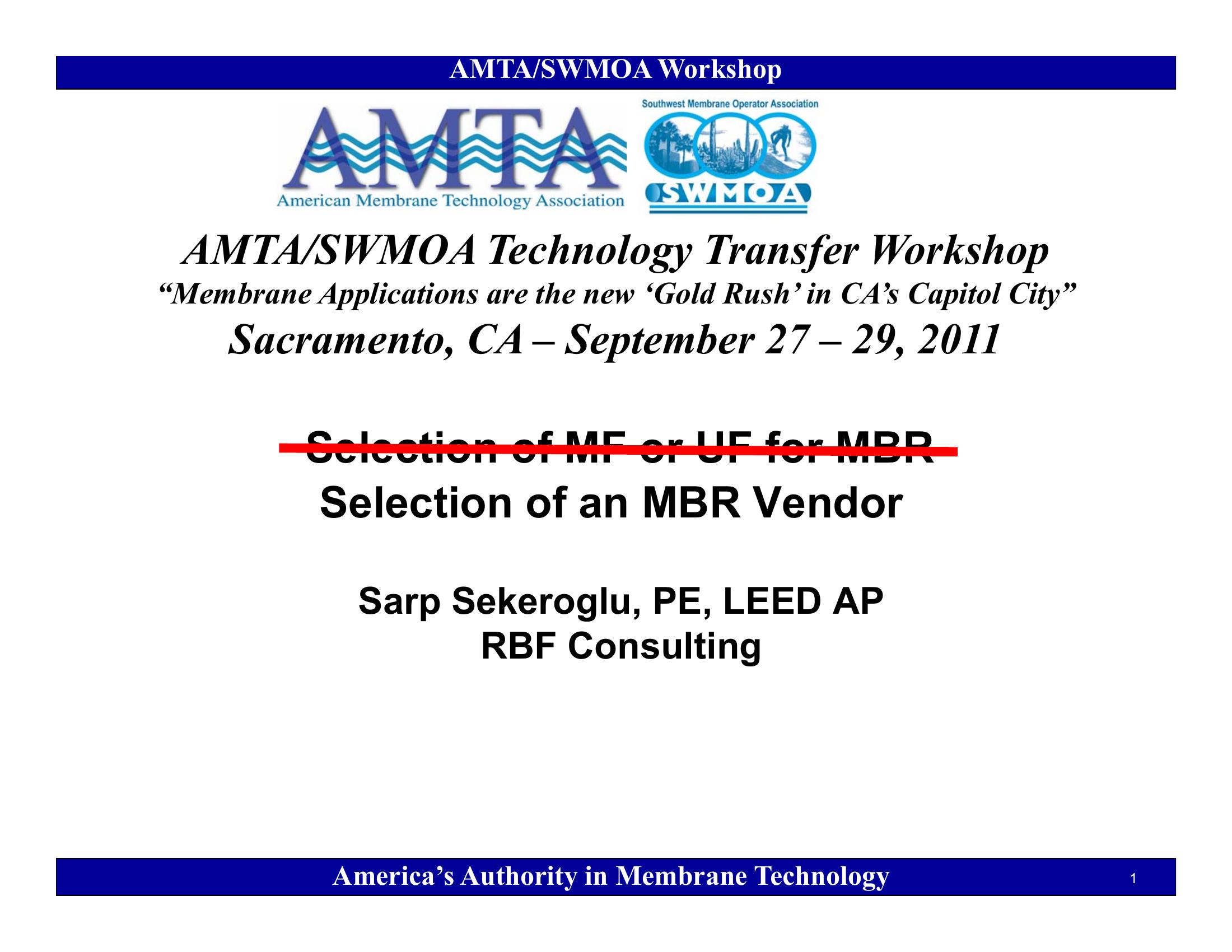 This presentation provides an overview of different types of MBRs and recommends selection guidelines for them. Emphasis is placed on different manufacturers and highlights the importance of target water quality; regulatory and space constraints; power and operational requirements; and costs for making a proper selection.