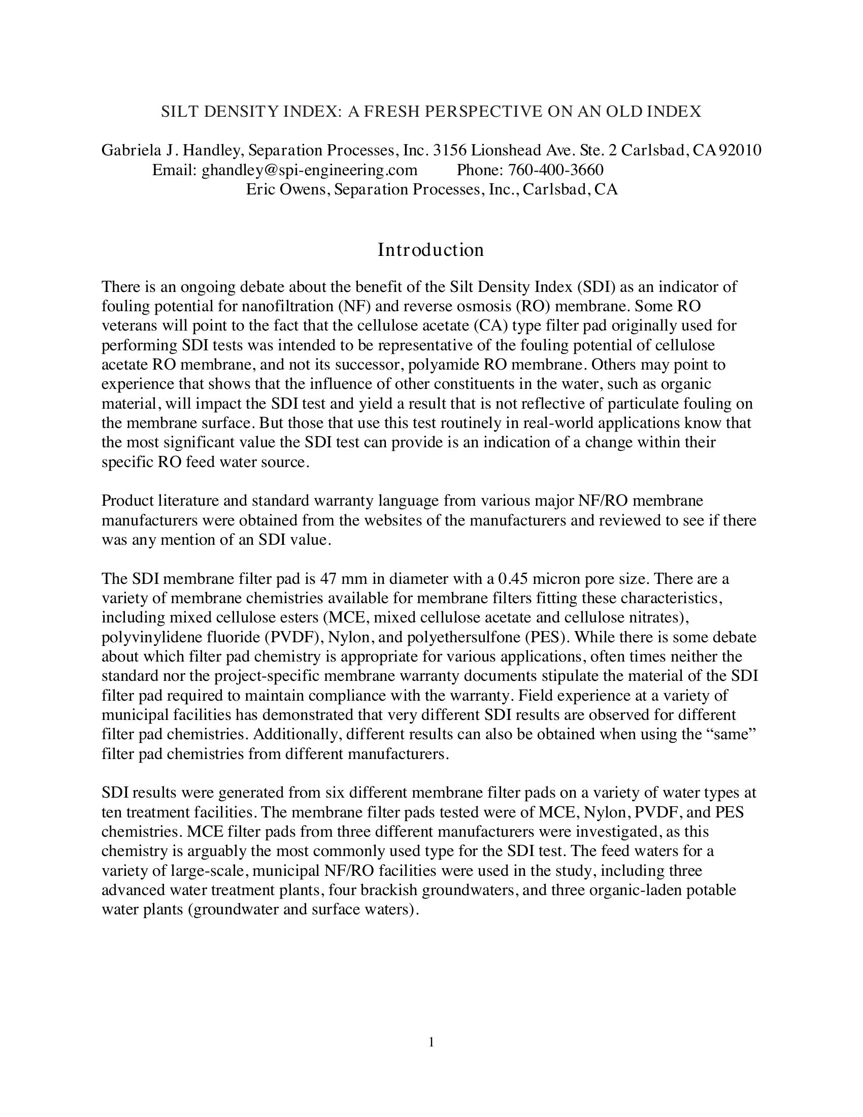 This paper demonstrates the need for consistency in the use and selection of silt density index (SDI) filter pad chemistries by membrane treatment plant operators for their specific facility. While it is not the authors? intention to identify the ?best? filter pad for use in the SDI test, the findings will illustrate the need for a thoughtful consideration of the filter pad used in the SDI test and how it may impact the operator?s ability to achieve the reverse osmosis (RO) warranty conditions.