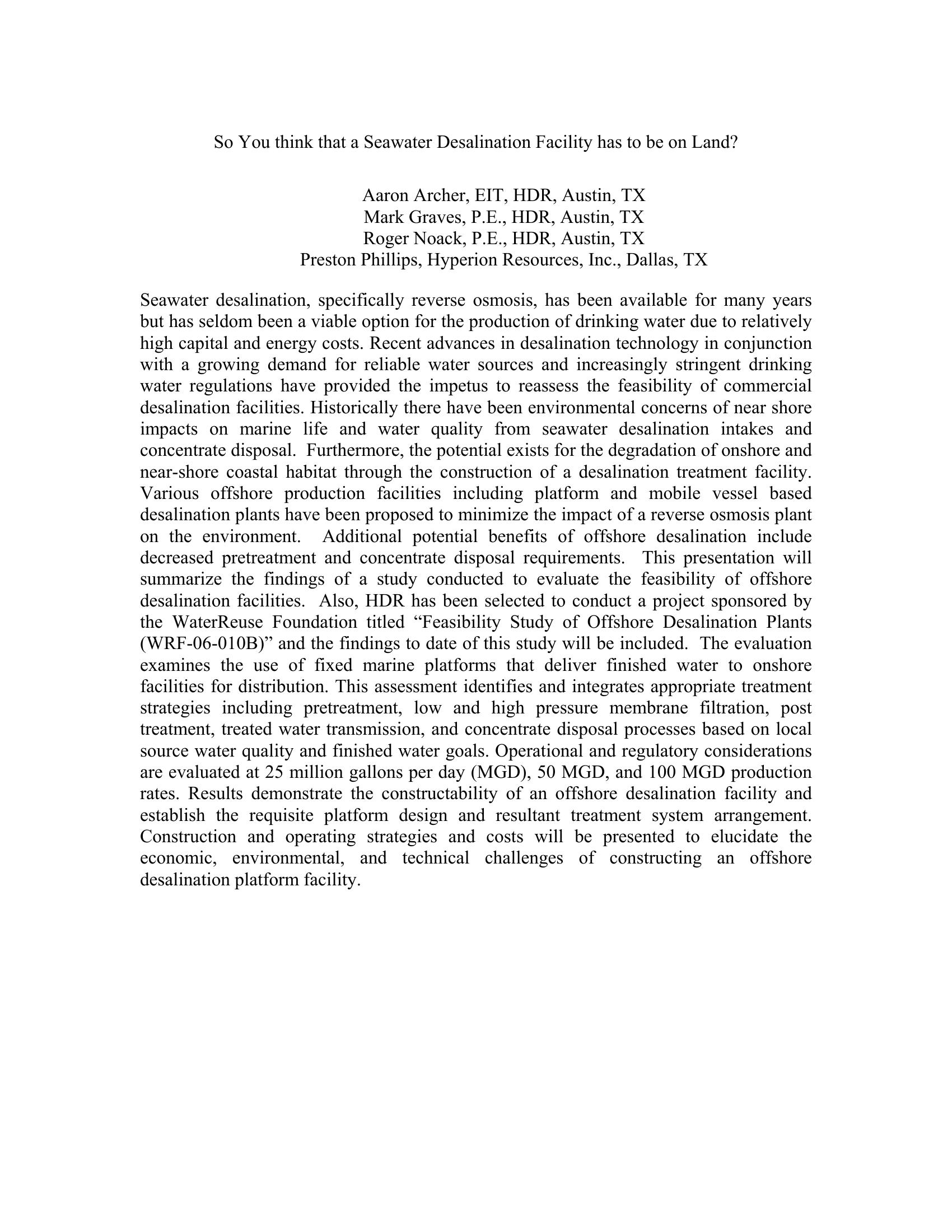 | Keywords | seawater desalination, reverse osmosis, platform site, feasibility study |