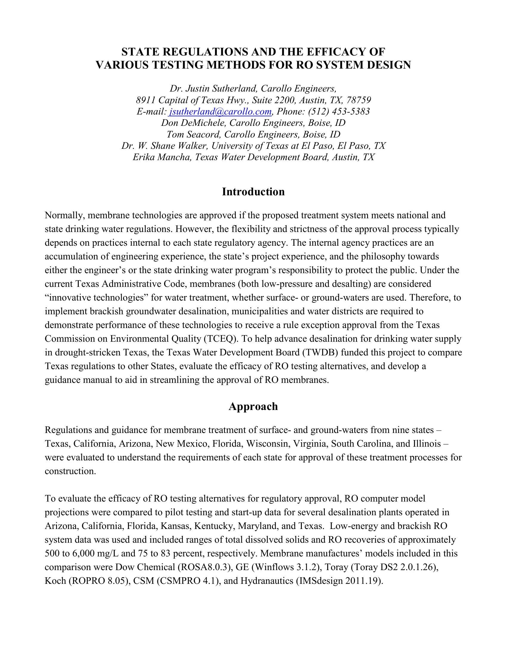 Normally membrane technologies are approved if they meet national and state drinking water regulations, but the flexibility and strictness of the approval process depends on the State. A key finding was the acknowledgement of the predictive value of computer models for regulatory approval of RO systems.