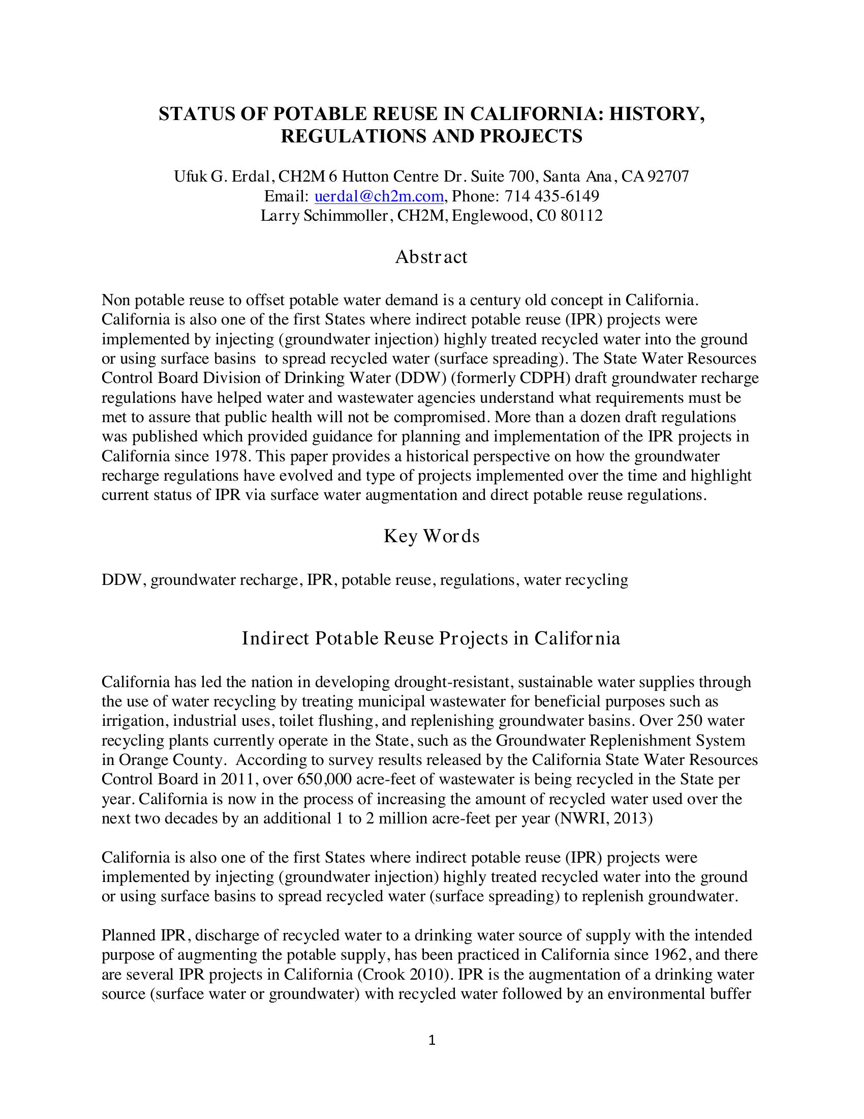 | Keywords | groundwater recharge, IPR, potable reuse, regulations, water recycling, California |
