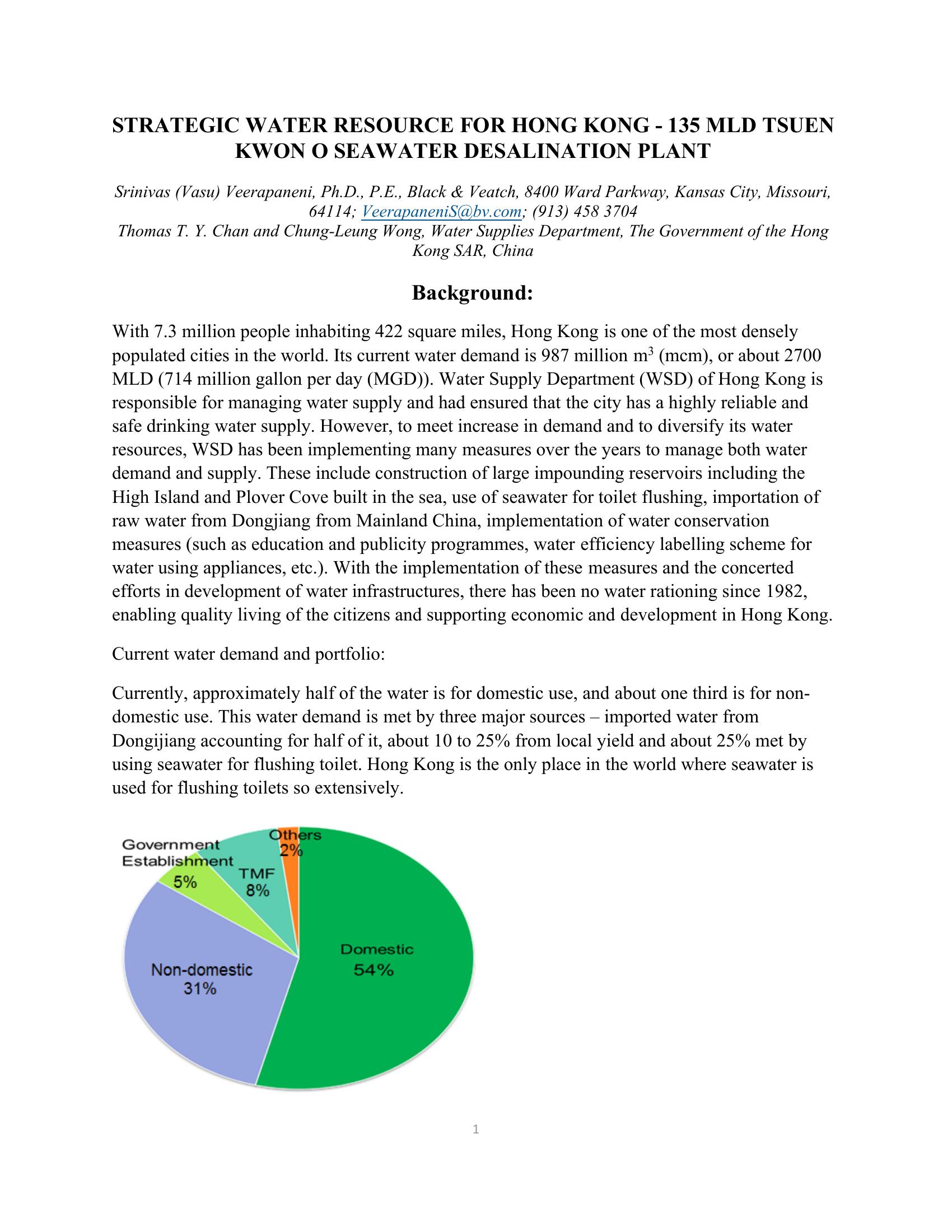 Hong Kong is one of the most densely populated regions that is experiencing stresses on its water resources. The Water Supply Department (WSD) of Hong Kong has initiated a Total Water Management strategy to manage demand and supply. As part of this effort, it is implementing a seawater desalination plant with 135 MLD capacity, expandable to 270 MLD. The plant has a submerged open intake, DAF, 2 pass RO to meet stringent bromide levels, post-treatment with lime and CO2 and on-site chlorine generation. The facility is procured under a Design Build Operate method, with transfer to the WSD to continue operations. The presentation will discuss planning, environmental issues and water quality results after blending with other sources.