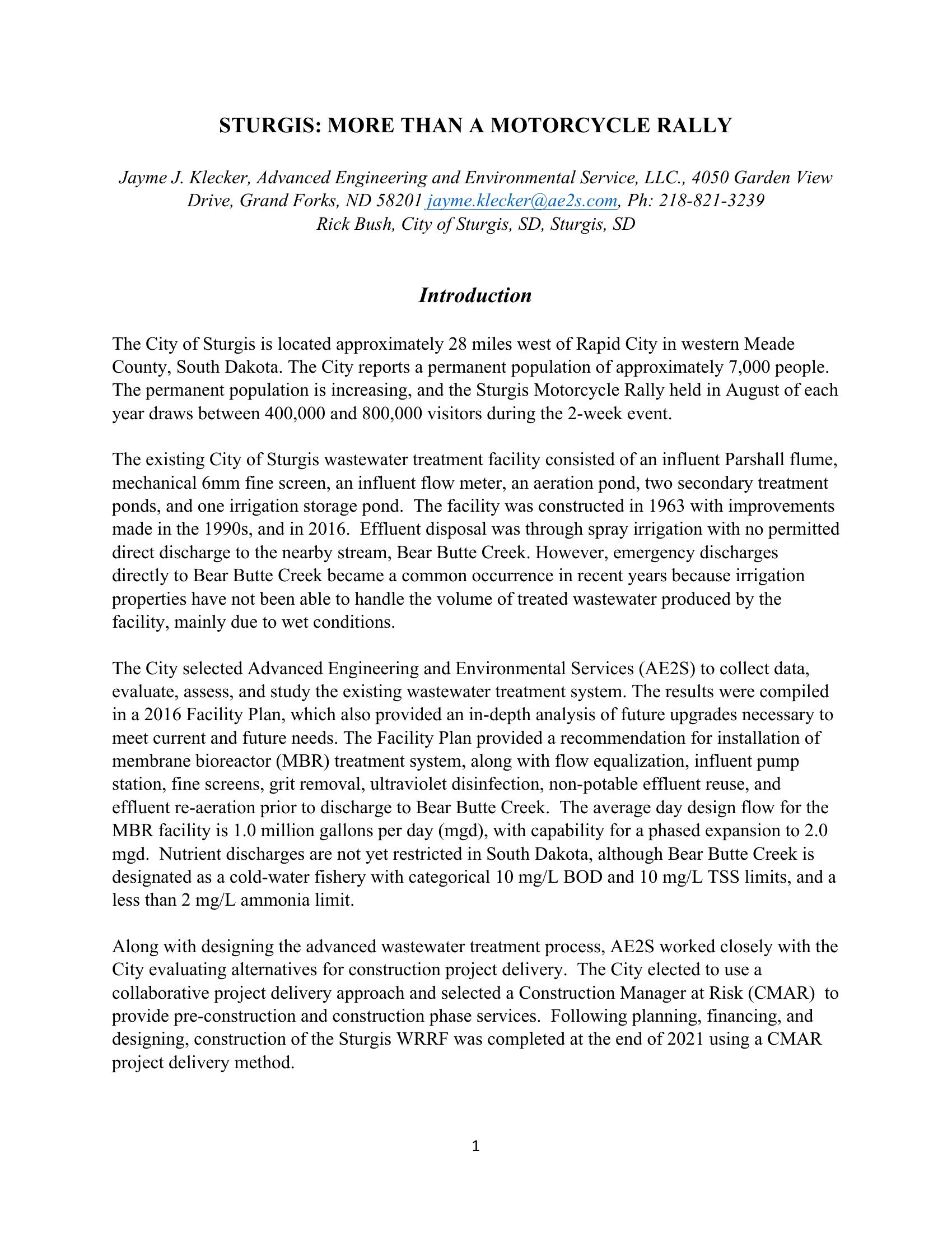 The City of Sturgis is located approximately 28 miles west of Rapid City in western Meade County, South Dakota. The City reports a permanent population of approximately 7,000 people. The permanent population is increasing, and the Sturgis Motorcycle Rally held in August of each year draws between 400,000 and 800,000 visitors during the 2-week event. The existing City of Sturgis wastewater treatment facility consisted of an influent Parshall flume, mechanical 6mm fine screen, an influent flow meter, an aeration pond, two secondary treatment ponds, and one irrigation storage pond. The facility was constructed in 1963 with improvements made in the 1990s, and in 2016. Effluent disposal was through spray irrigation with no permitted direct discharge to the nearby stream, Bear Butte Creek. However, emergency discharges directly to Bear Butte Creek became a common occurrence in recent years because irrigation properties have not been able to handle the volume of treated wastewater produced by the facility, mainly due to wet conditions. The City selected Advanced Engineering and Environmental Services (AE2S) to collect data, evaluate, assess, and study the existing wastewater treatment system. The results were compiled in a 2016 Facility Plan, which also provided an in-depth analysis of future upgrades necessary to meet current and future needs. The Facility Plan provided a recommendation for installation of membrane bioreactor (MBR) treatment system, along with flow equalization, influent pump station, fine screens, grit removal, ultraviolet disinfection, non-potable effluent reuse, and effluent re-aeration prior to discharge to Bear Butte Creek. The average day design flow for the MBR facility is 1.0 million gallons per day (mgd), with capability for a phased expansion to 2.0 mgd. Nutrient discharges are not yet restricted in South Dakota, although Bear Butte Creek is designated as a cold-water fishery with categorical 10 mg/L BOD and 10 mg/L TSS limits, and a less than 2 mg/L ammonia limit.
