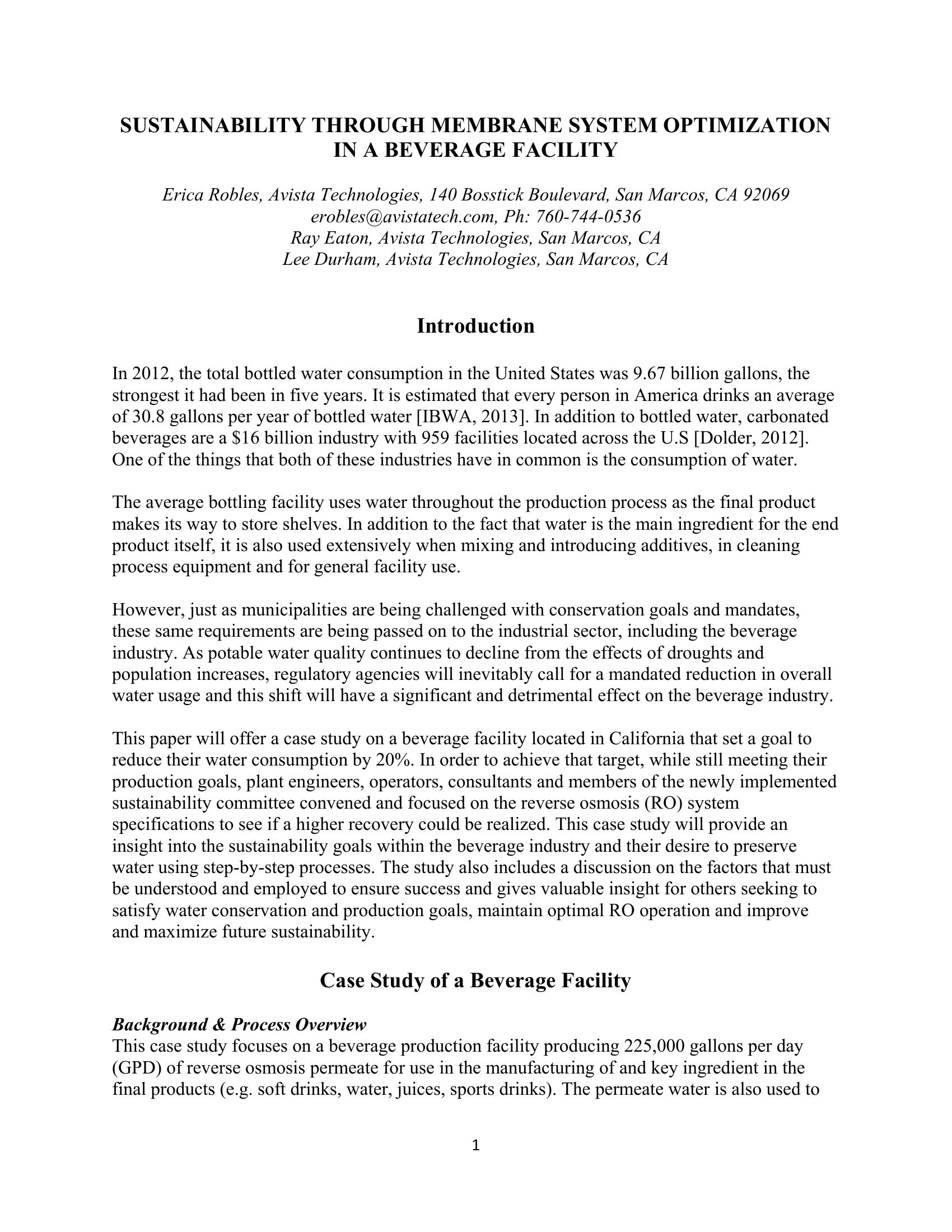 This paper offers a case study on a California beverage facility that set a goal to reduce their water consumption by 20%. In order to achieve that target and still meet their production goals, plant engineers, operators, consultants and members of the newly implemented sustainability committee convened and focused on the reverse osmosis (RO) system specifications to see if a higher recovery could be realized. This study will provide an insight into the sustainability goals within the beverage industry and their desire to preserve water using step-by-step processes. It also includes a discussion on the factors that must be understood and employed to ensure success and gives valuable insight for others seeking to satisfy water conservation and production goals, maintain optimal RO operation and improve and maximize future sustainability.