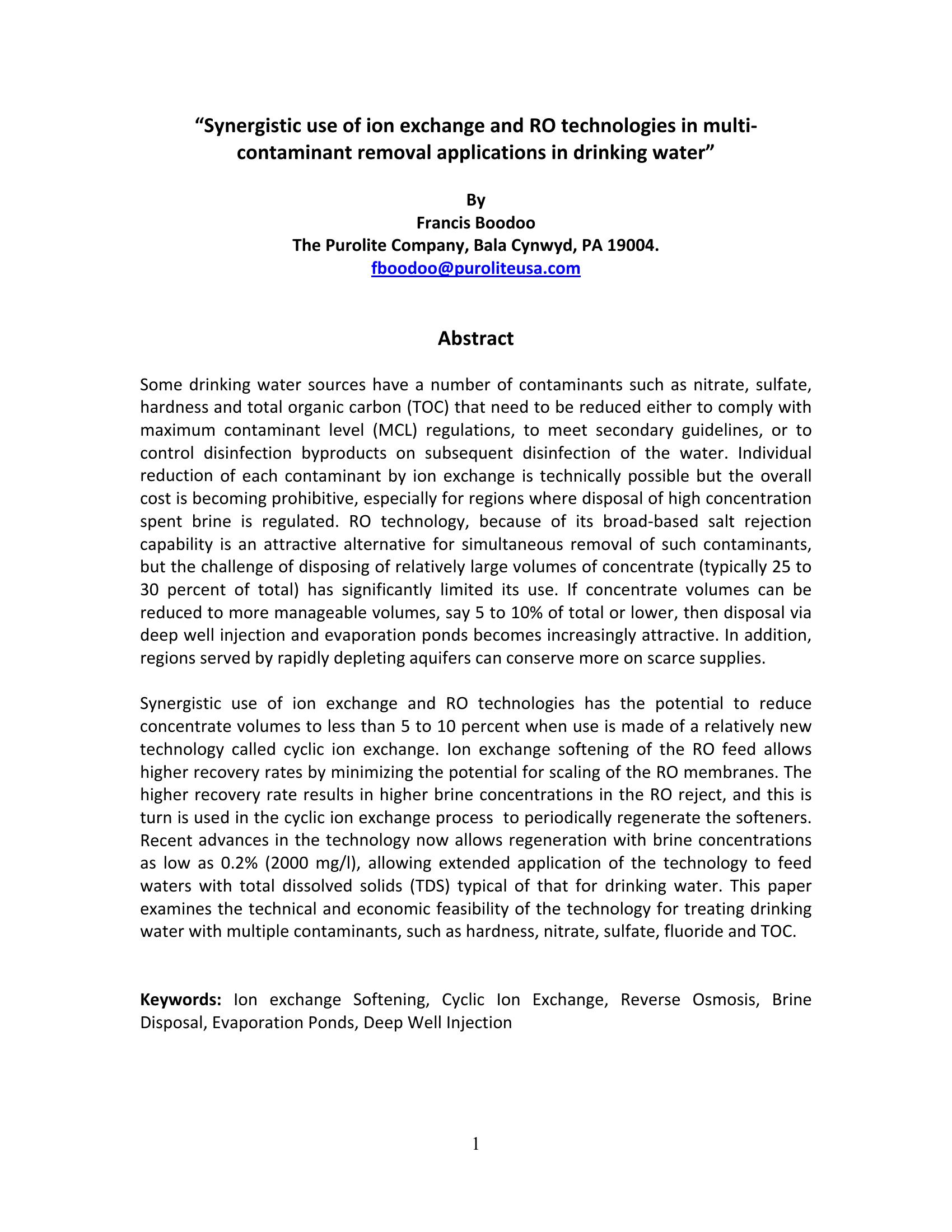 | Keywords | ion exchange, reverse osmosis, concentrate disposal |