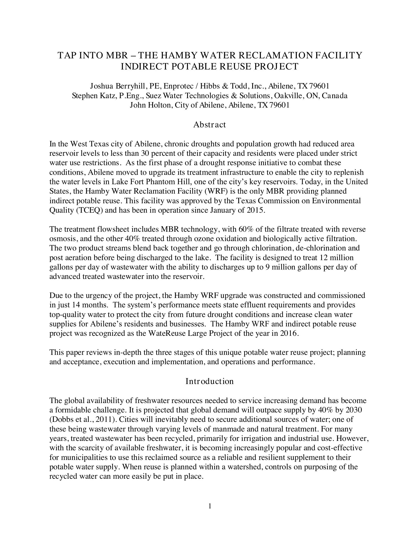 | Keywords | MBR, Hamby WRF, Indirect Potable Water Reuse |