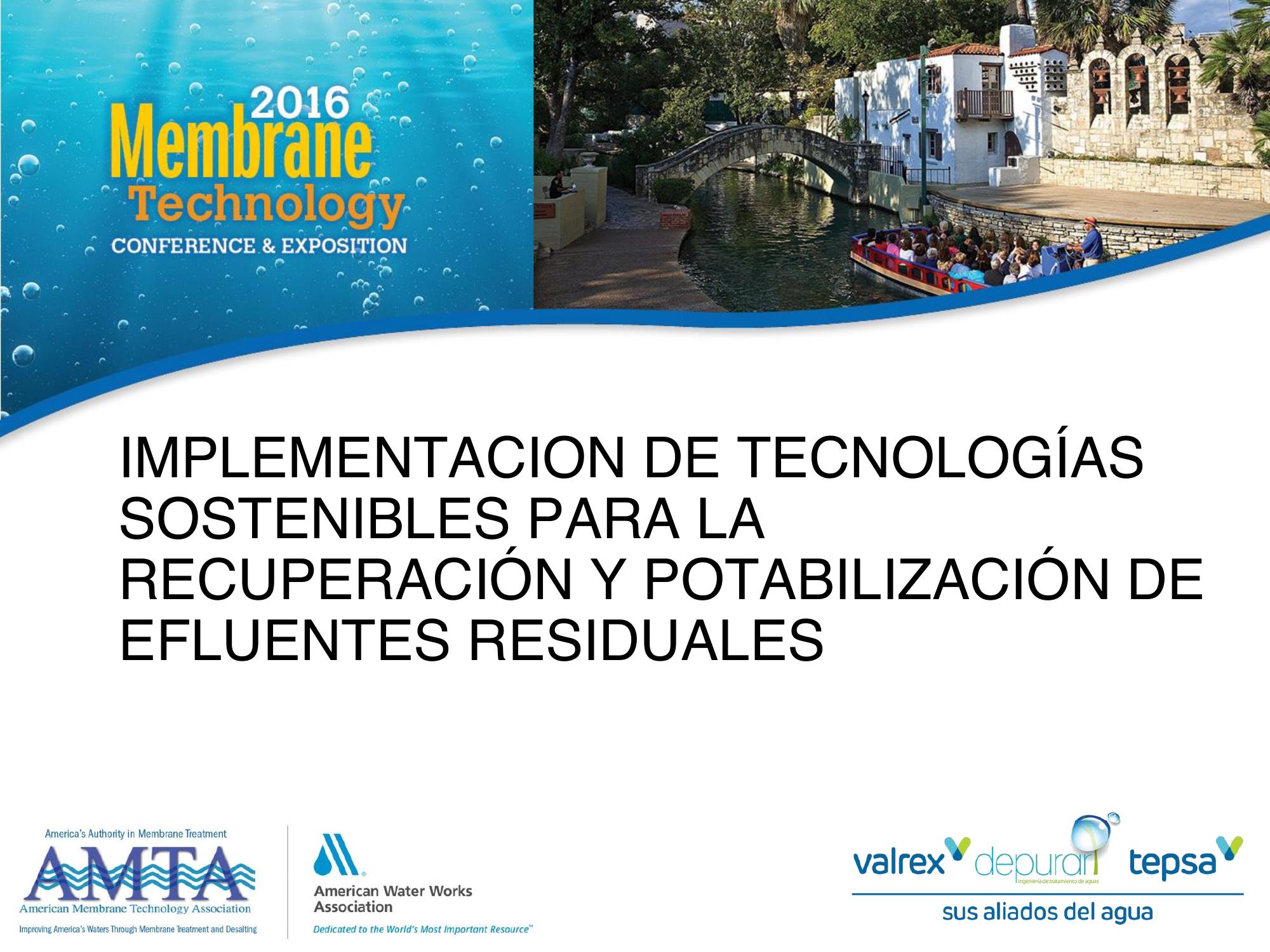 This PowerPoint is in Spanish and recovery of wastewater effluents and is entitled Implementation de technology’s sosteibles para la Recuperacio’n y potabilization de efluentes residuales or Implementation of sustainable technologies and stabilixation of recovery wastewater effluents