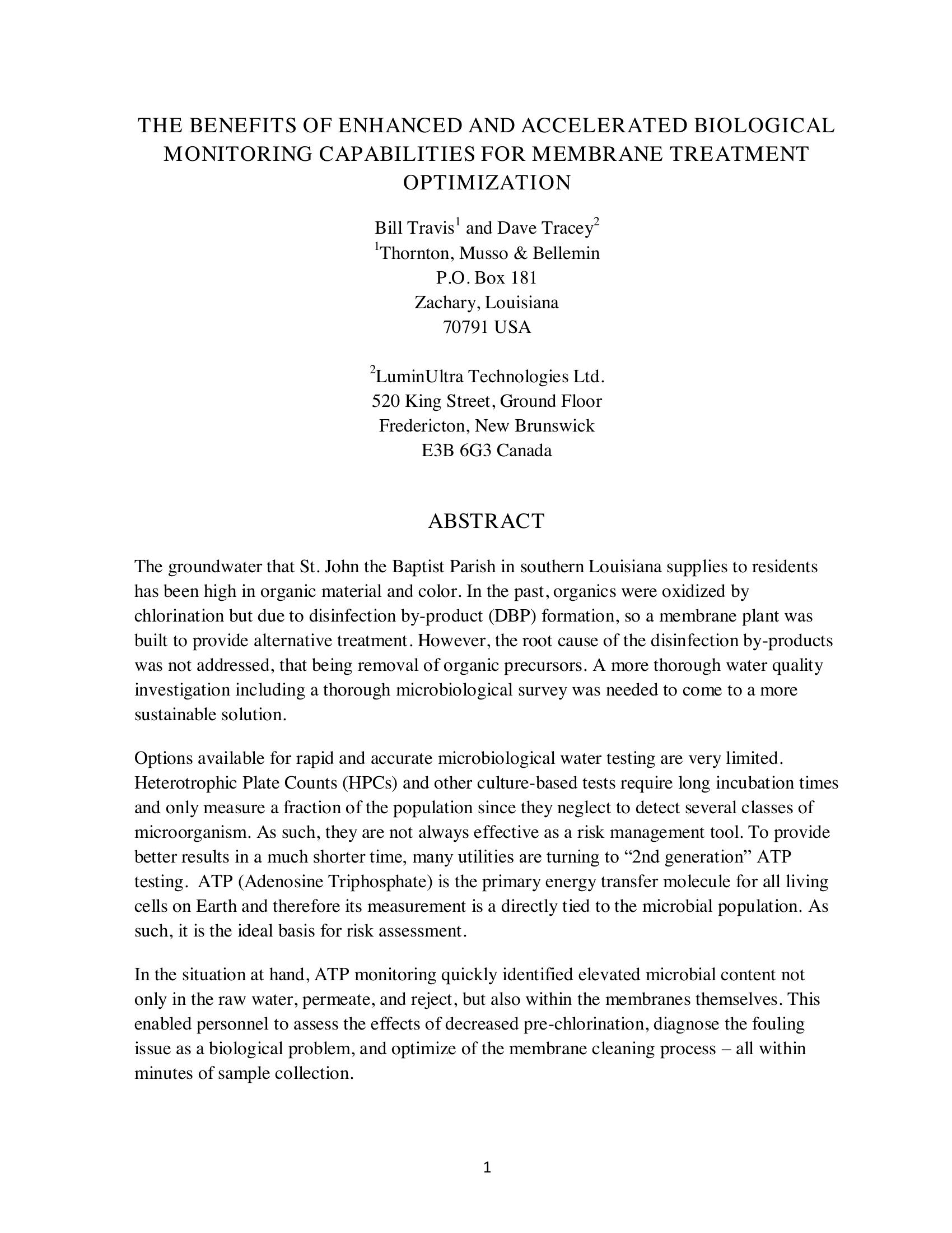 The groundwater that St. John the Baptist Parish in southern Louisiana supplies to residents has been high in organic material and color. Options available for rapid and accurate microbiological water testing are very limited. ATP (Adenosine Triphosphate) is the primary energy transfer molecule for all living cells on Earth and therefore its measurement is a directly tied to the microbial population. As such, it is the ideal basis for risk assessment. For this groundwater treated with reverse osmosis, ATP monitoring quickly identified elevated microbial content not only in the raw water, permeate, and reject, but also within the membranes themselves.