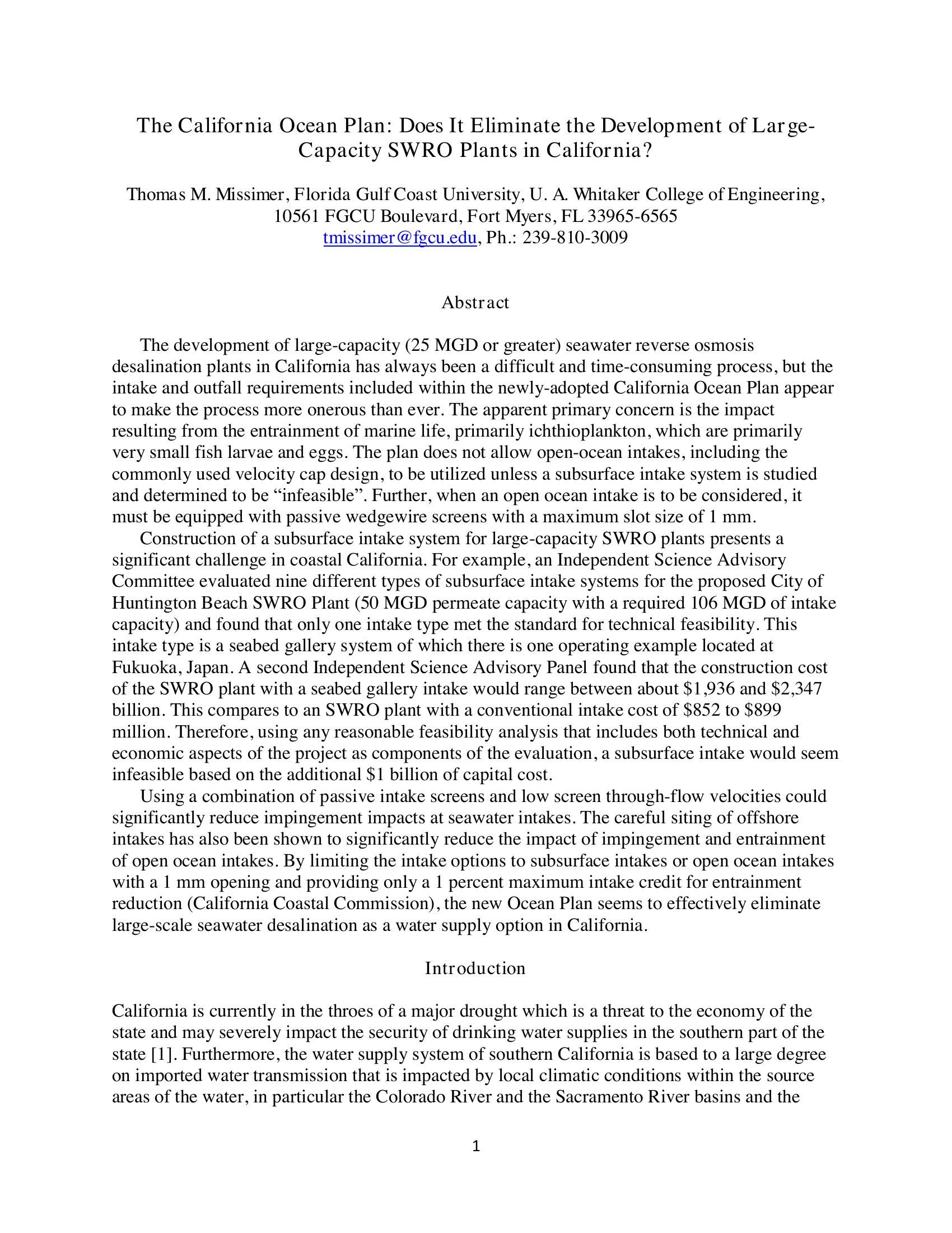 The California Ocean Plan: Does it Eliminate the Development of Large-Capacity SWRO Plants in California