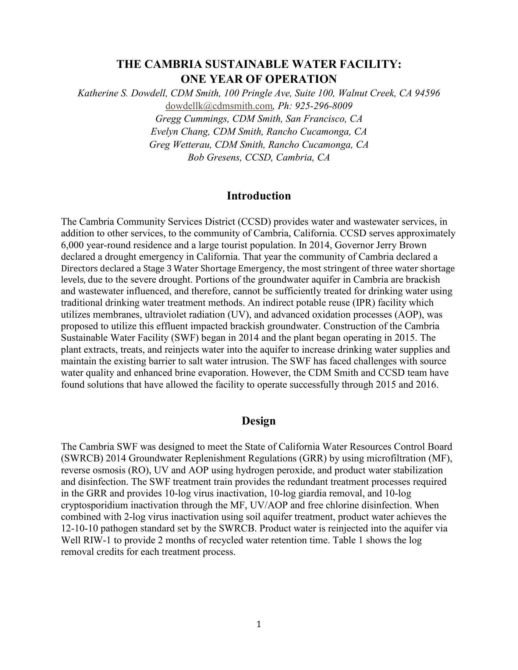 The Cambria Sustainable Water Facility: One Year of Operation