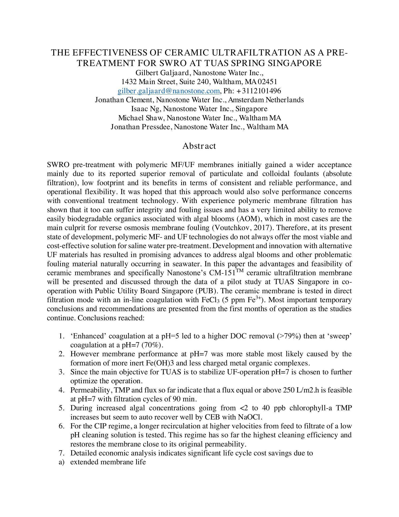 SWRO pre-treatment with polymeric MF/UF membranes initially gained a wider acceptance mainly due to its reported superior removal of particulate and colloidal foulants (absolute filtration), low footprint and its benefits in terms of consistent and reliable performance, and operational flexibility. It was hoped that this approach would also solve performance concerns with conventional treatment technology. With experience polymeric membrane filtration has shown that it too can suffer integrity and fouling issues and has a very limited ability to remove easily biodegradable organics associated with algal blooms (AOM), which in most cases are the main culprit for reverse osmosis membrane fouling (Voutchkov, 2017). Therefore, at its present state of development, polymeric MF- and UF technologies do not always offer the most viable and cost-effective solution for saline water pre-treatment. Development and innovation with alternative UF materials has resulted in promising advances to address algal blooms and other problematic fouling material naturally occurring in seawater. In this paper the advantages and feasibility of ceramic membranes and specifically Nanostoneís CM-151TM ceramic ultrafiltration membrane will be presented and discussed through the data of a pilot study at TUAS Singapore in co-operation with Public Utility Board Singapore (PUB). The ceramic membrane is tested in direct filtration mode with an in-line coagulation with FeCl3 (5 ppm Fe3+). Most important temporary conclusions and recommendations are presented from the first months of operation as the studies continue.
