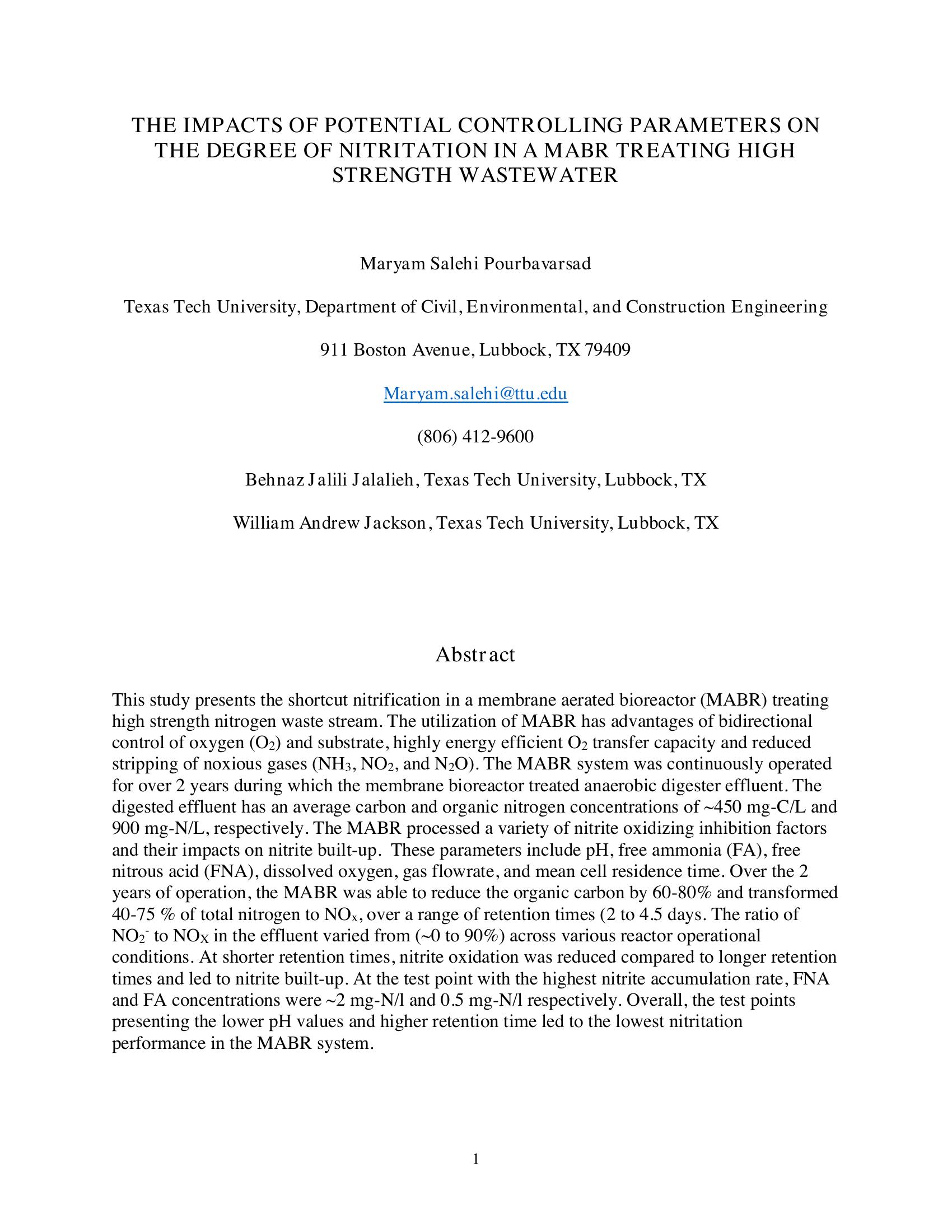 The Impacts of Potential Controlling Parameters on the Degree of Nitritation in a MABR Treating High Strength Wastewater