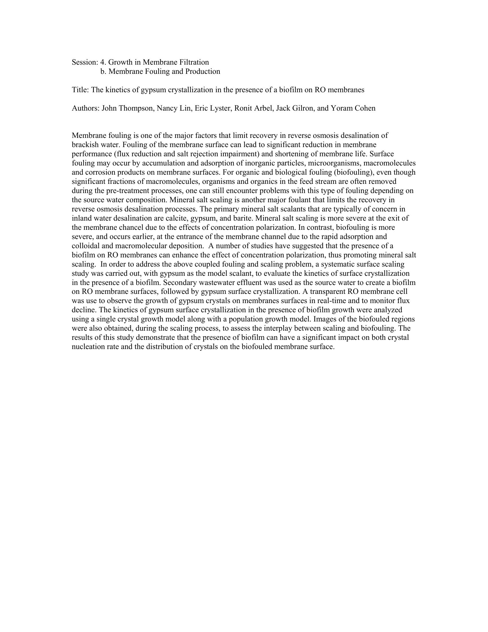 | Keywords | gypsum crystallization kinetics, biofilm, RO membrane |