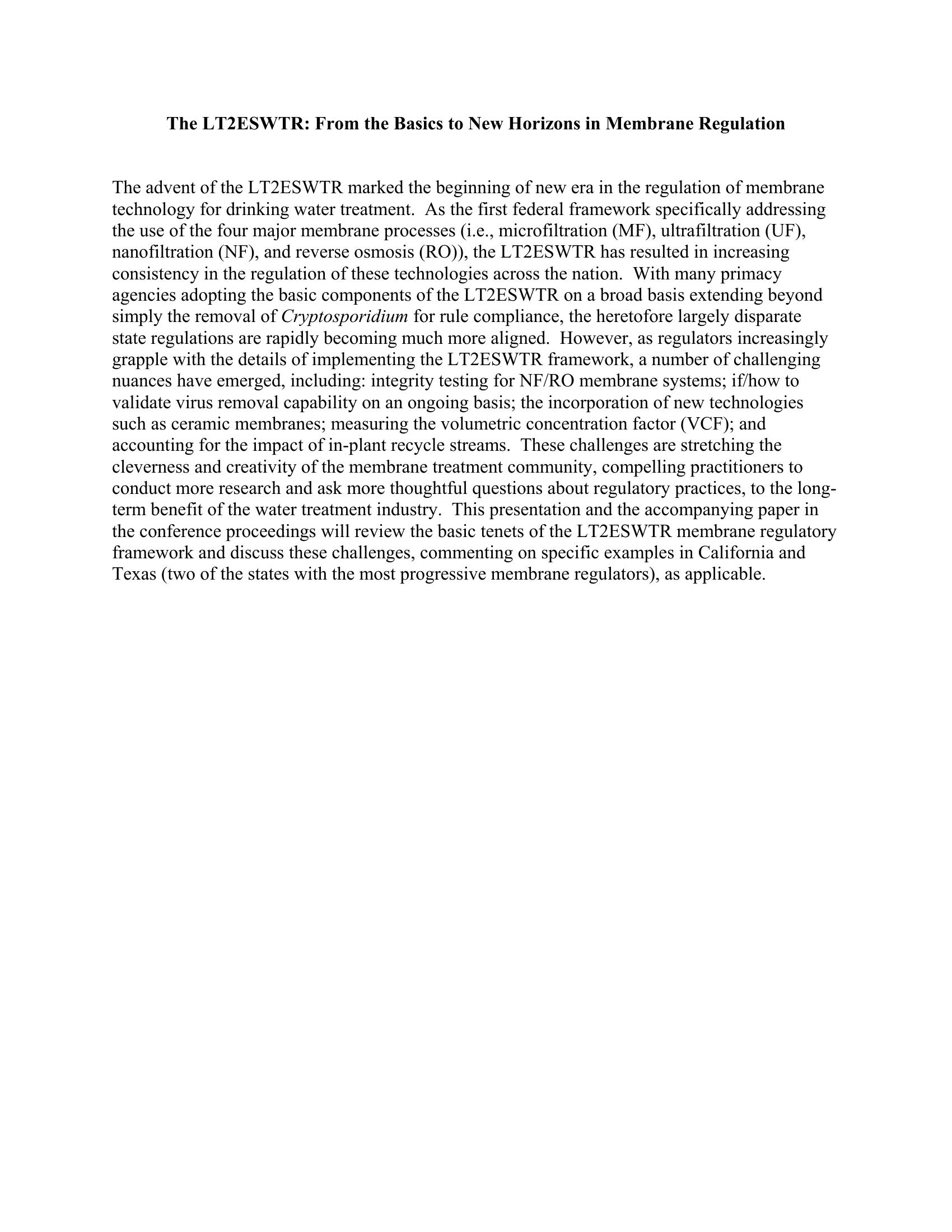 The LT2ESWTR: From the Basics to New Horizons in Membrane Regulation