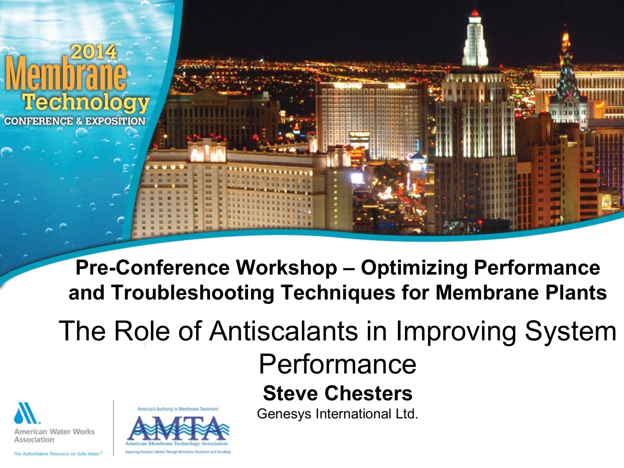 This presentation on antisaclants is from a preconference workshop in 2014 that discussed optimization in membrane plant performance. A preliminary discussion about scale formation along with it’s importance in membrane systems is given. Diagnosing membrane system problems is given along with solutions to address each issue is discussed