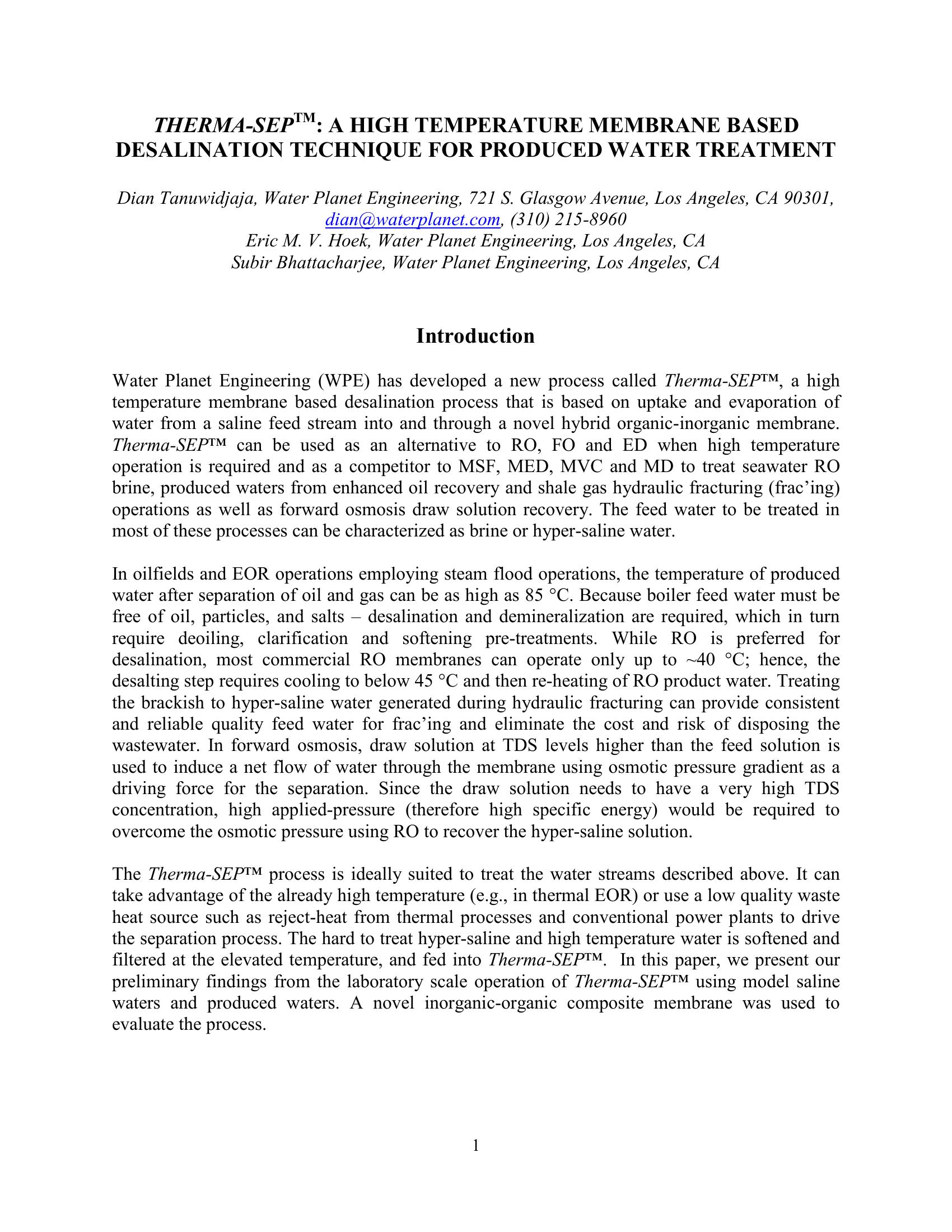 This paper presents preliminary findings from the laboratory scale operation of Therma-SEP? using model saline waters and produced waters. A novel inorganic-organic composite membrane was used to evaluate the process.