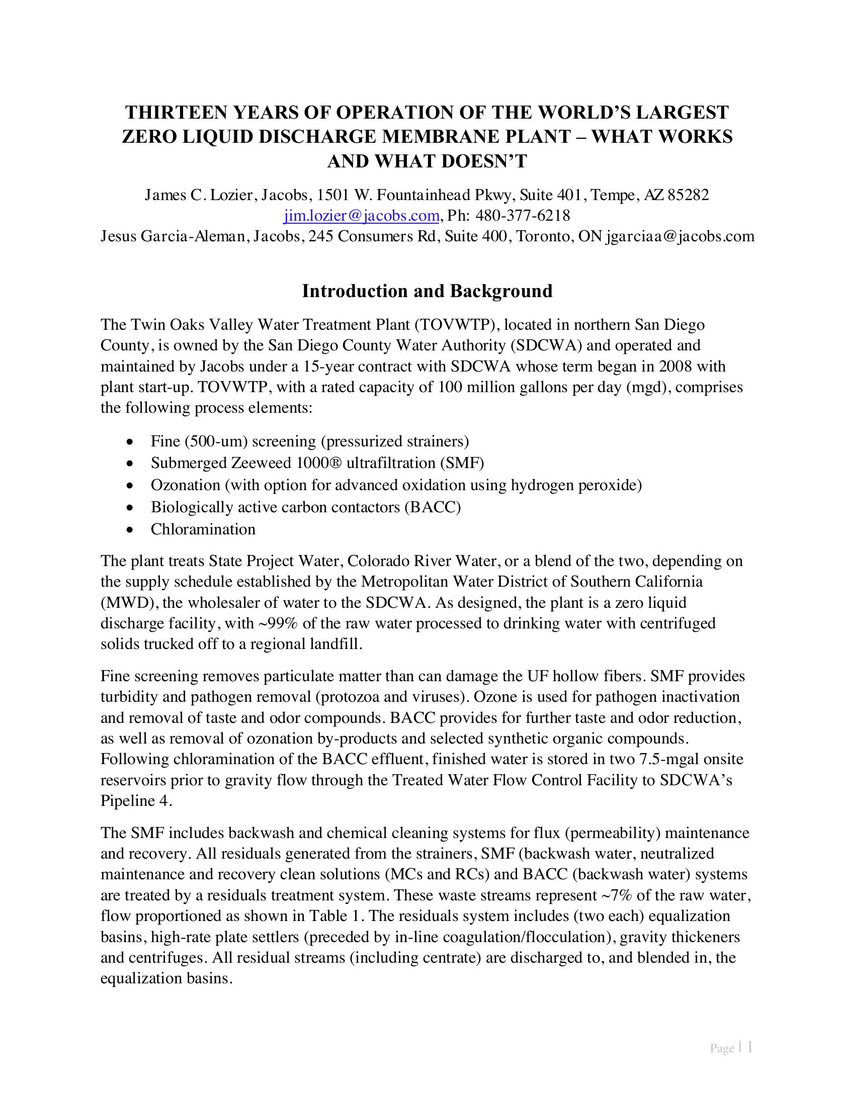 The Twin Oaks Valley Water Treatment Plant (TOVWTP), located in northern San Diego County, is owned by the San Diego County Water Authority (SDCWA) and operated and maintained by Jacobs under a 15-year contract with SDCWA whose term began in 2008 with plant start-up. TOVWTP, with a rated capacity of 100 million gallons per day (mgd), comprises the following process elements: ï Fine (500-um) screening (pressurized strainers) ï Submerged Zeeweed 1000Æ ultrafiltration (SMF) ï Ozonation (with option for advanced oxidation using hydrogen peroxide) ï Biologically active carbon contactors (BACC) ï Chloramination The plant treats State Project Water, Colorado River Water, or a blend of the two, depending on the supply schedule established by the Metropolitan Water District of Southern California (MWD), the wholesaler of water to the SDCWA. As designed, the plant is a zero liquid discharge facility, with ~99% of the raw water processed to drinking water with centrifuged solids trucked off to a regional landfill. Fine screening removes particulate matter than can damage the UF hollow fibers. SMF provides turbidity and pathogen removal (protozoa and viruses). Ozone is used for pathogen inactivation and removal of taste and odor compounds. BACC provides for further taste and odor reduction, as well as removal of ozonation by-products and selected synthetic organic compounds. Following chloramination of the BACC effluent, finished water is stored in two 7.5-mgal onsite reservoirs prior to gravity flow through the Treated Water Flow Control Facility to SDCWAís Pipeline 4. The SMF includes backwash and chemical cleaning systems for flux (permeability) maintenance and recovery. All residuals generated from the strainers, SMF (backwash water, neutralized maintenance and recovery clean solutions (MCs and RCs) and BACC (backwash water) systems are treated by a residuals treatment system. These waste streams represent ~7% of the raw water, flow proportioned as shown in Table 1. The residuals system includes (two each) equalization basins, high-rate plate settlers (preceded by in-line coagulation/flocculation), gravity thickeners and centrifuges. All residual streams (including centrate) are discharged to, and blended in, the equalization basins.