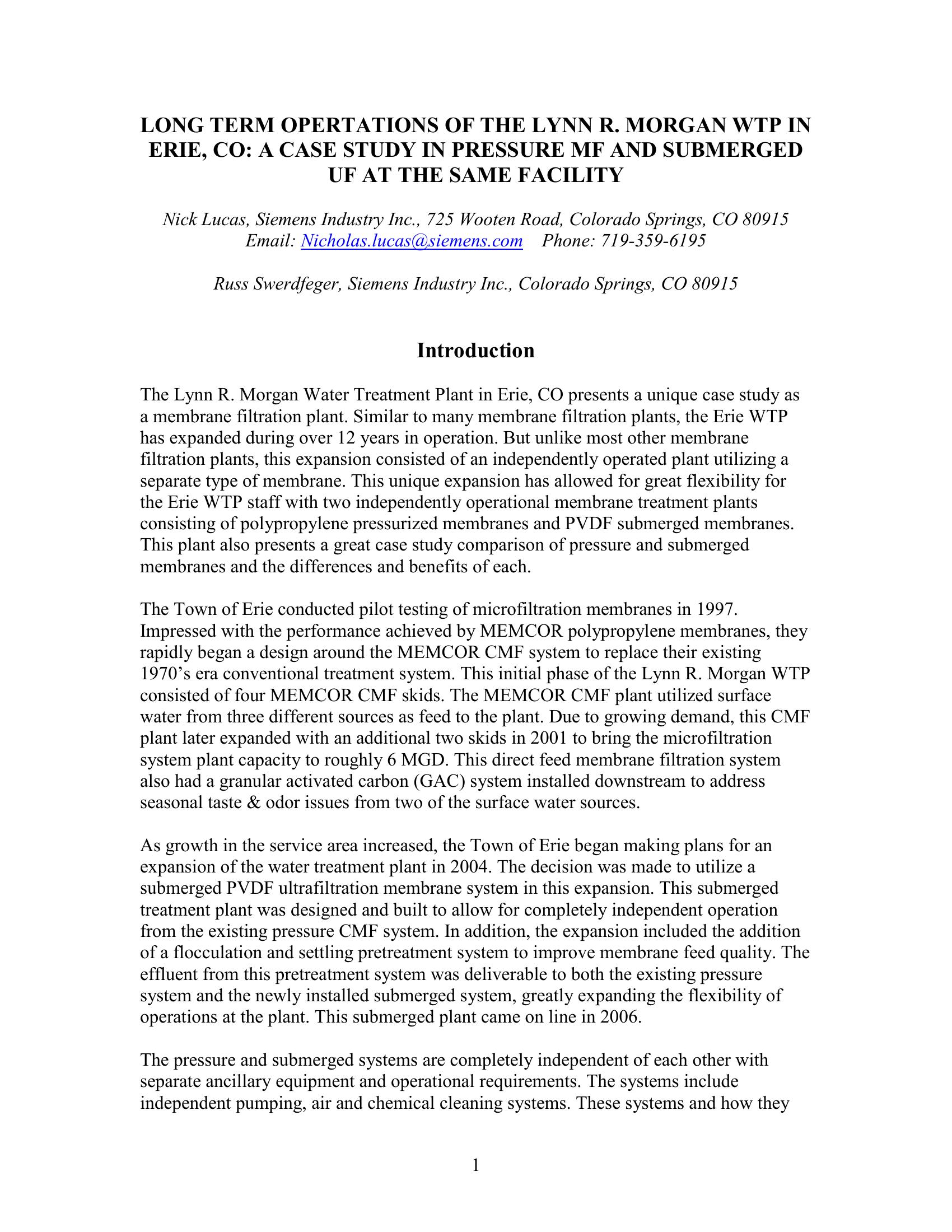 Town of Erie Lynn R Morgan Water Treatment Facility: A Case Study in Long Term Operations of Pressure MF and Submerged UF at the Same Facility