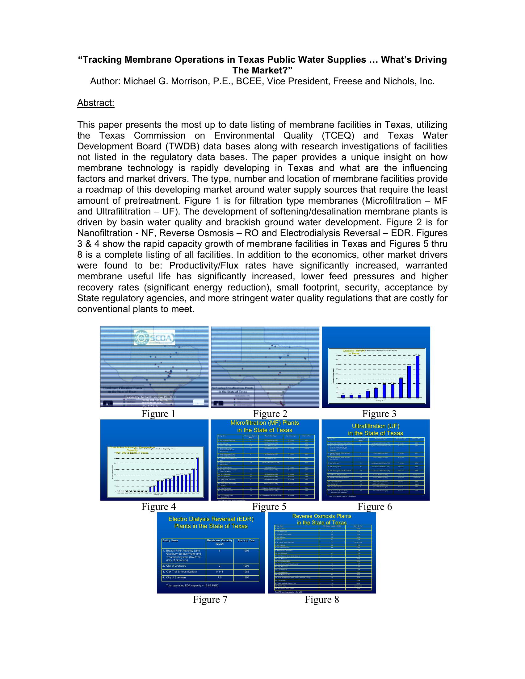 This paper presents a listing of membrane facilities in Texas, using the Texas Commission on Environmental Quality (TCEQ) and Texas Water Development Board (TWDB) data bases along with research investigations of facilities not listed. A unique insight is offered into how membrane technology is rapidly developing in Texas and what is influencing factors and market drivers. The type, number and location of membrane facilities provides a roadmap of this developing market around water supply sources that require the least amount of pretreatment. Microfiltration – MF and Ultrafilitration – UF) are included. The development of softening/desalination membrane plants is found to be driven by basin water quality and brackish ground water development. Nanofiltration – NF, Reverse Osmosis – RO and Electrodialysis Reversal – EDR are also included. The rapid growth of membrane facilities is driven by economics and a variety of other market drivers including: increased productivity/flux rates, extended productive membrane life, lower feed pressures and higher recovery rates (significant energy reduction), smaller footprint, security, acceptance by State regulatory agencies, and more stringent water quality regulations that are costly for conventional plants to meet.