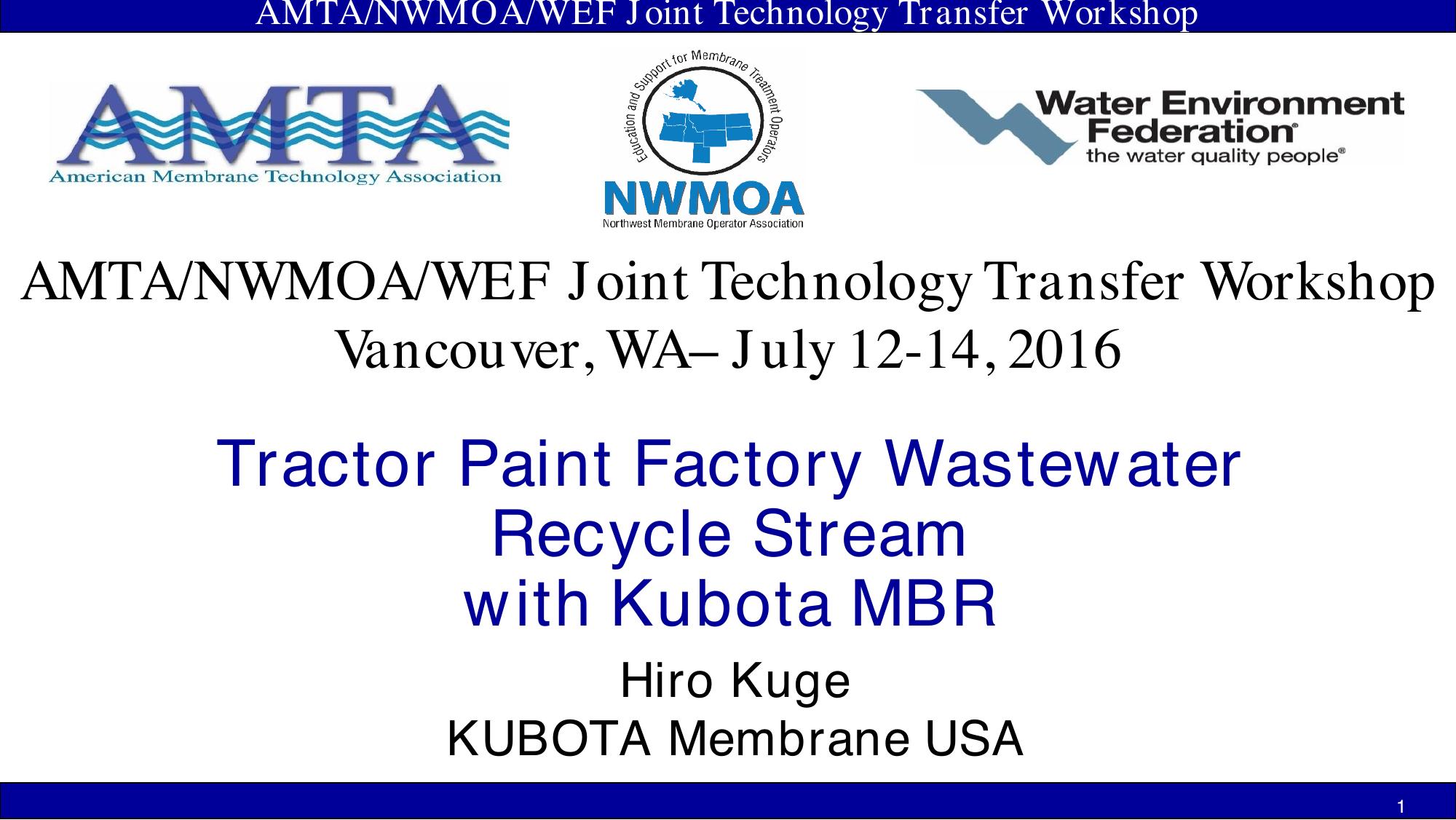 A tractor manufacturing factory is very similar to an automobile manufacturing factory, both using significant amounts of water for the pre-paint washing process. Before the tractor parts are painted, they are washed in several steps to remove dust and oils, and to provide surface coating. The wastewater from each step has different characteristics and contains some heavy metals such as Ni and Zn. At the Kubota Industrial Equipment Factory in Jefferson, FA, the wastewater treatment process has a unique pre-treatment, Kubota MBR, and RO. The treated water is recycled back to the pre-paint washing process. By recycling this water, the factory saves $70,000 per year.