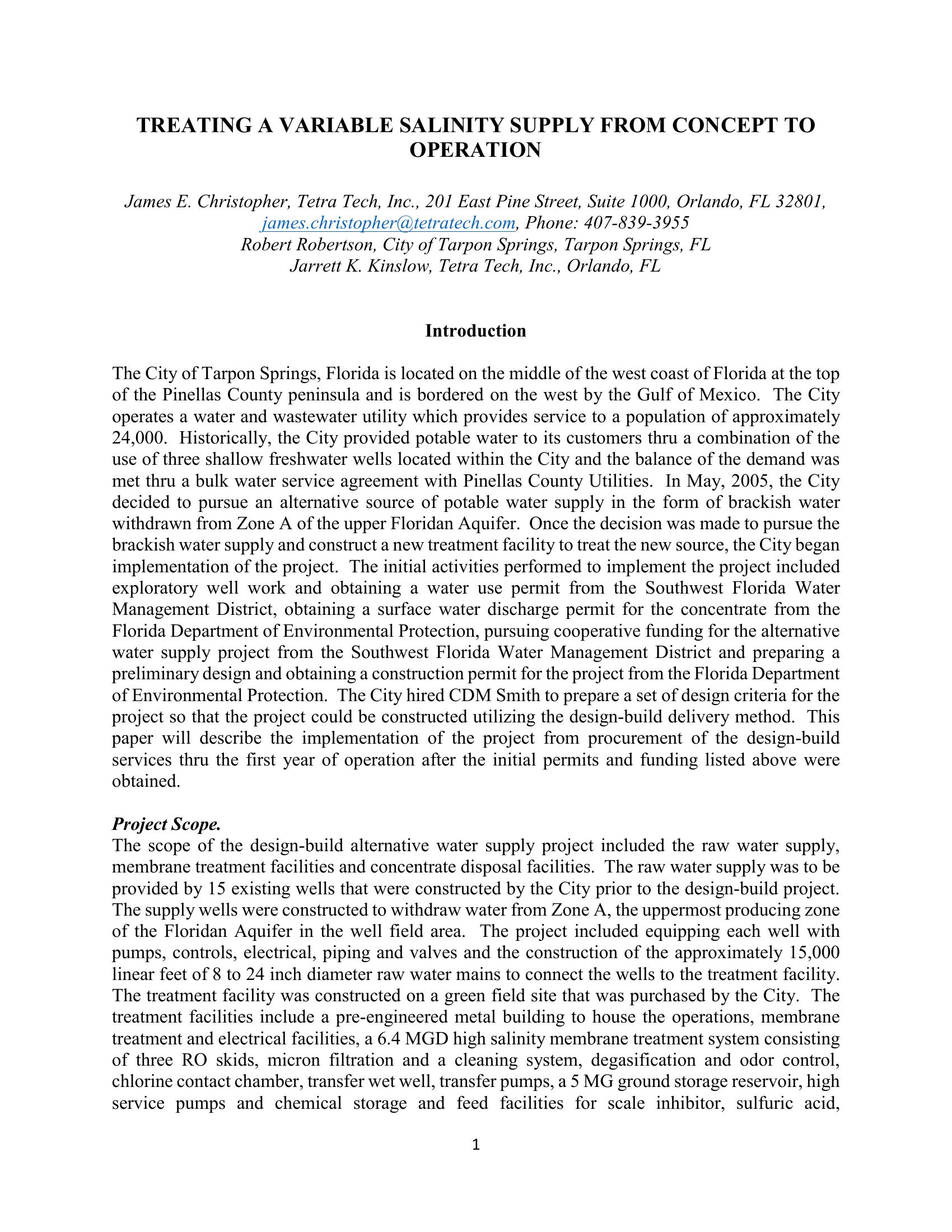 The paper will describe the design of a reverse osmosis treatment facility that is capable of treating a variable salinity ground water supply with total dissolved solids ranging from 3,000 to 16,600 mg/L without any significant changes in the installed equipment. The paper will be based upon the work that was performed to design the City of Tarpon Springs Alternative Water Supply Facility. The characteristics of the initial and degraded raw water quality and the finished water quality goals will be described. The treatment system and the operations and controls features of the plant utilized to accommodate variations in the raw water quality, raw water blend ratio, recovery and concentrate disposal methods will be discussed.