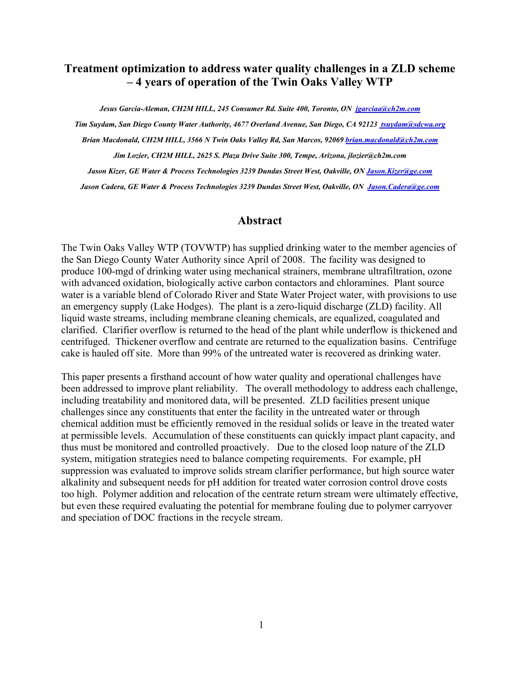 Treatment Optimization of the Twin Oaks Valley WTP