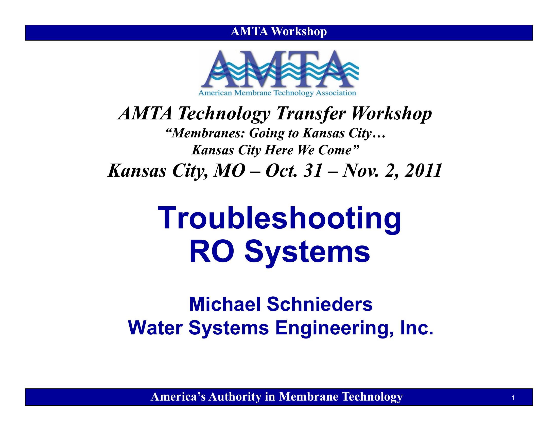 This presentation discusses the three most common types of RO membrane fouling. Identification of the fouling mechanism is discussed. Examples of chemical fouling, biofouling, and colloidal fouling are presented.