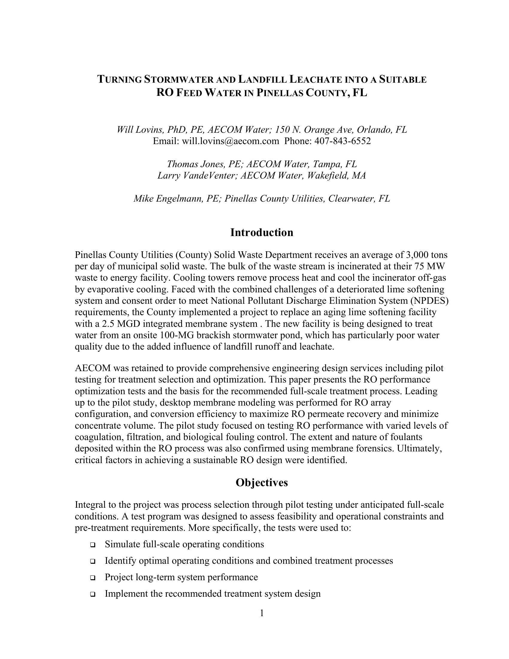 Pinellas County Utilities (County) Solid Waste Department receives an average of 3,000 tons per day of municipal solid waste. The bulk of the waste stream is incinerated at their 75 MW waste to energy facility. Cooling towers remove process heat and cool the incinerator off-gas by evaporative cooling. Faced with the combined challenges of a deteriorated lime softening system and consent order to meet National Pollutant Discharge Elimination System (NPDES) requirements, the County implemented a project to replace an aging lime softening facility with a 2.5 MGD integrated membrane system. The new facility is being designed to treat water from an onsite 100-MG brackish stormwater pond, which has particularly poor water quality due to the influence of landfill leachate.