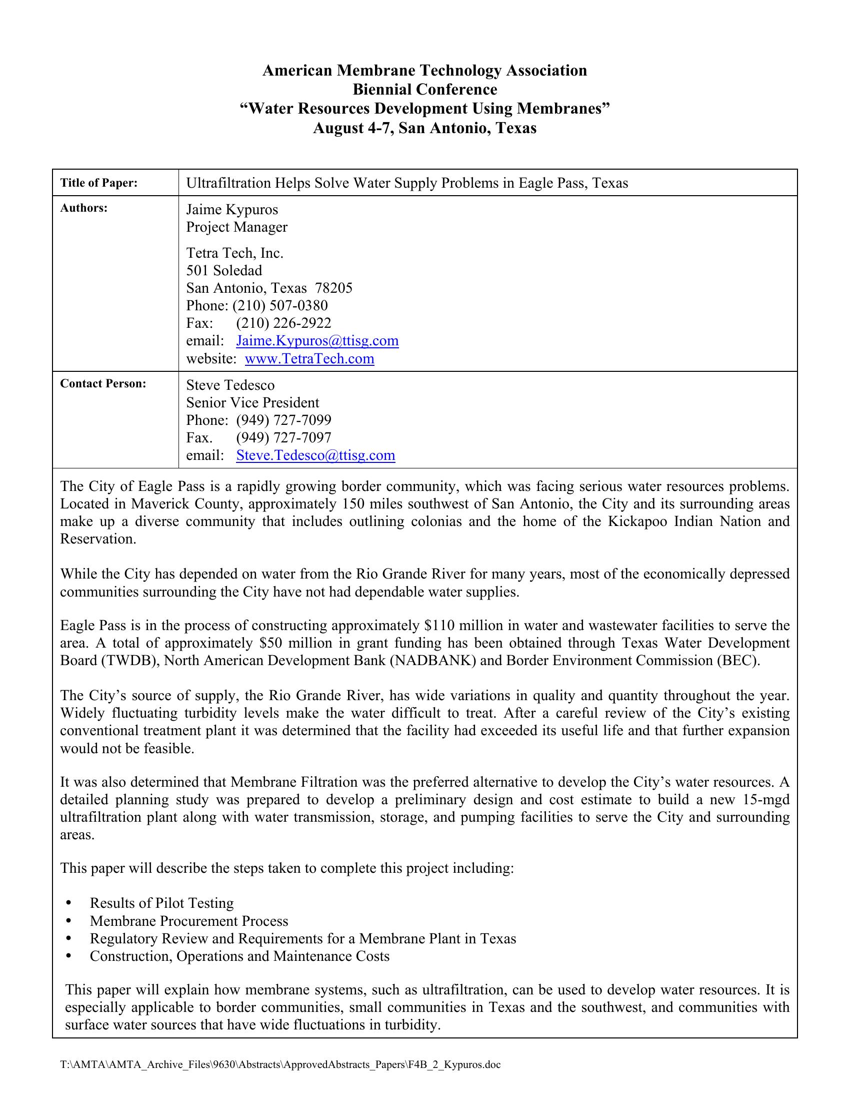 | Keywords | ultrafiltration, Eagle Pass Texas, membrane systems |