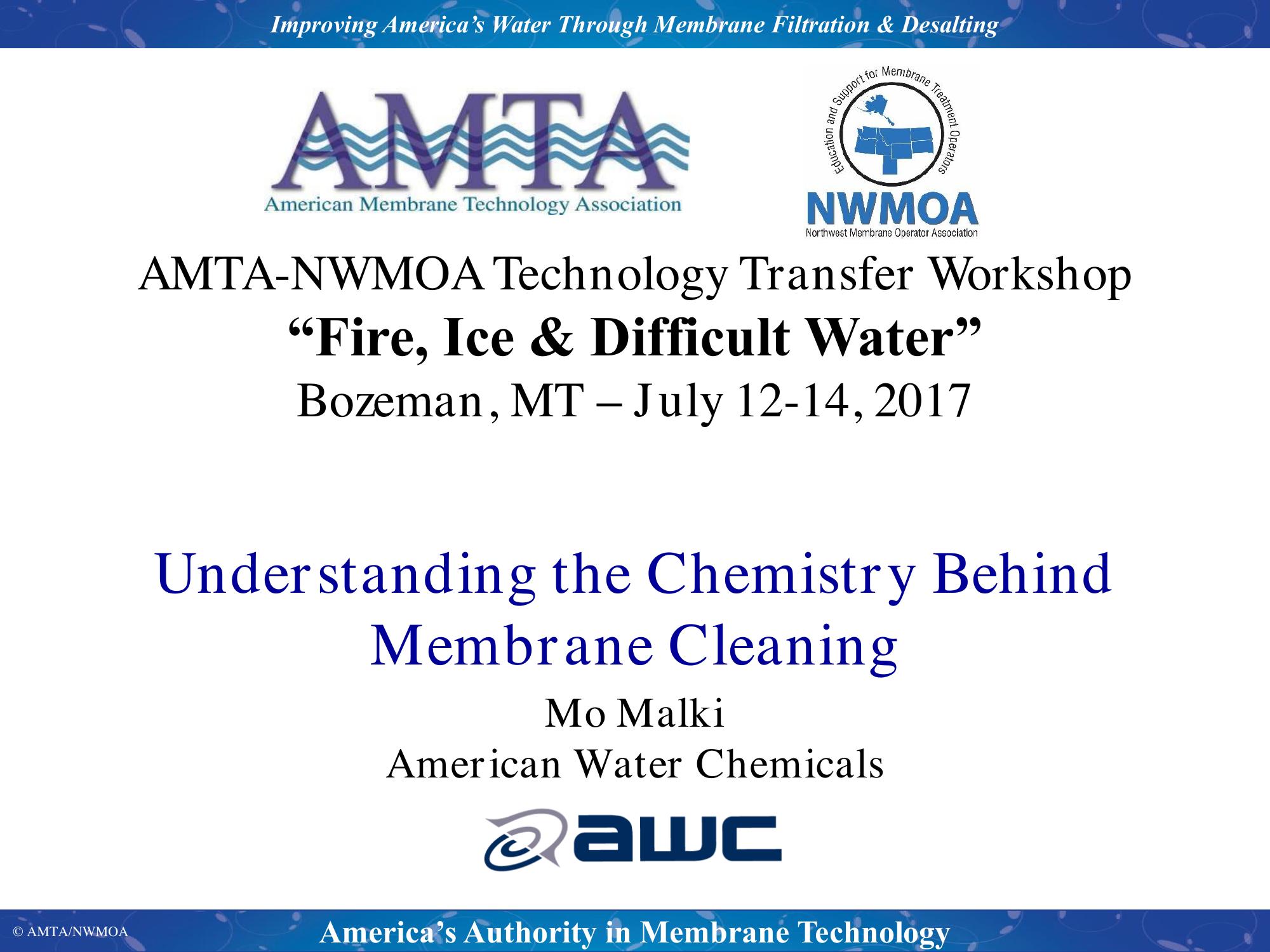 This presentation discusses different cleaning chemicals and techniques. It explains the chemistry of membrane cleaning, and how chemicals interact with different foulants under different conditions.