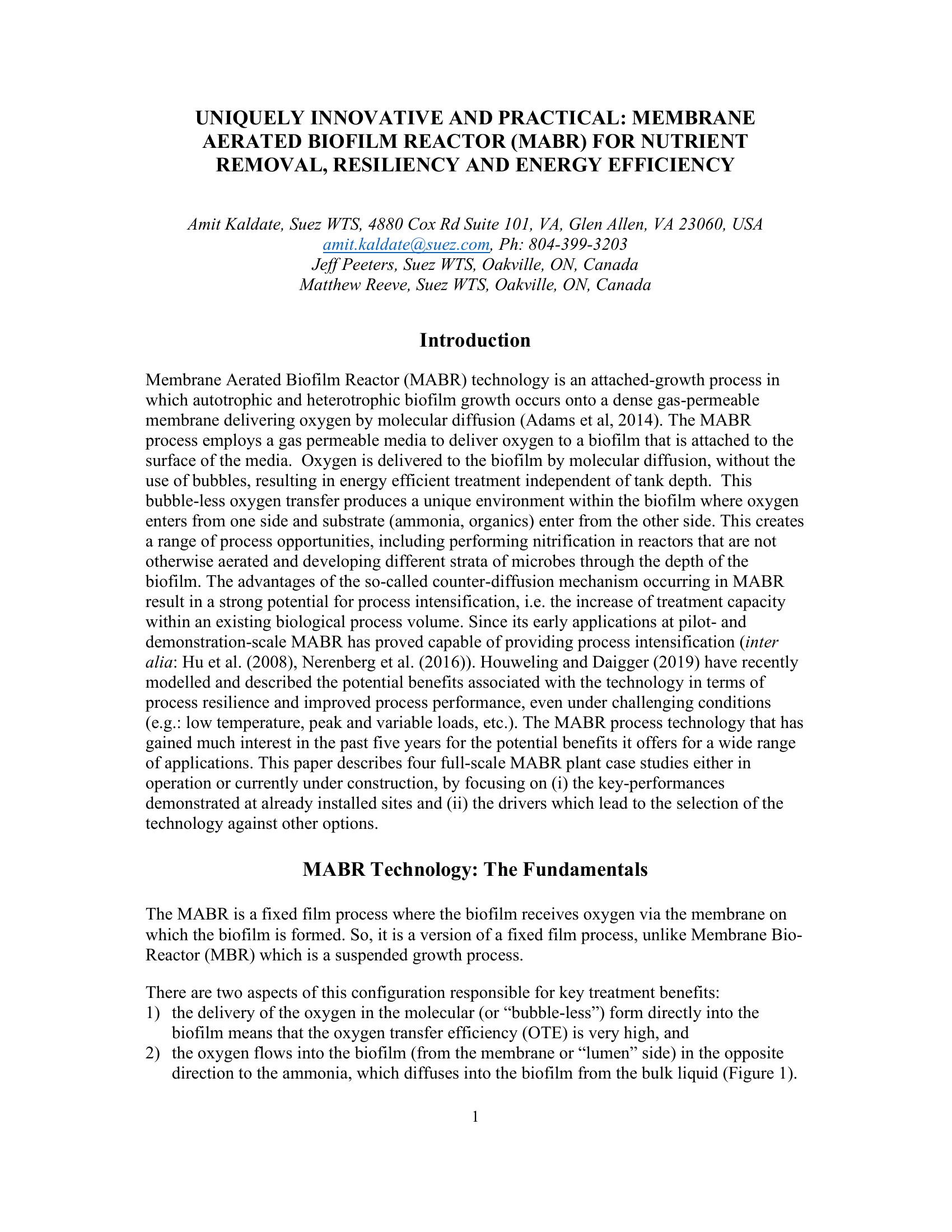 Uniquely Innovative and Practical: Membrane Aerated Biofilm Reactor (MABR) for Nutrient Removal, Resiliency and Energy Efficiency
