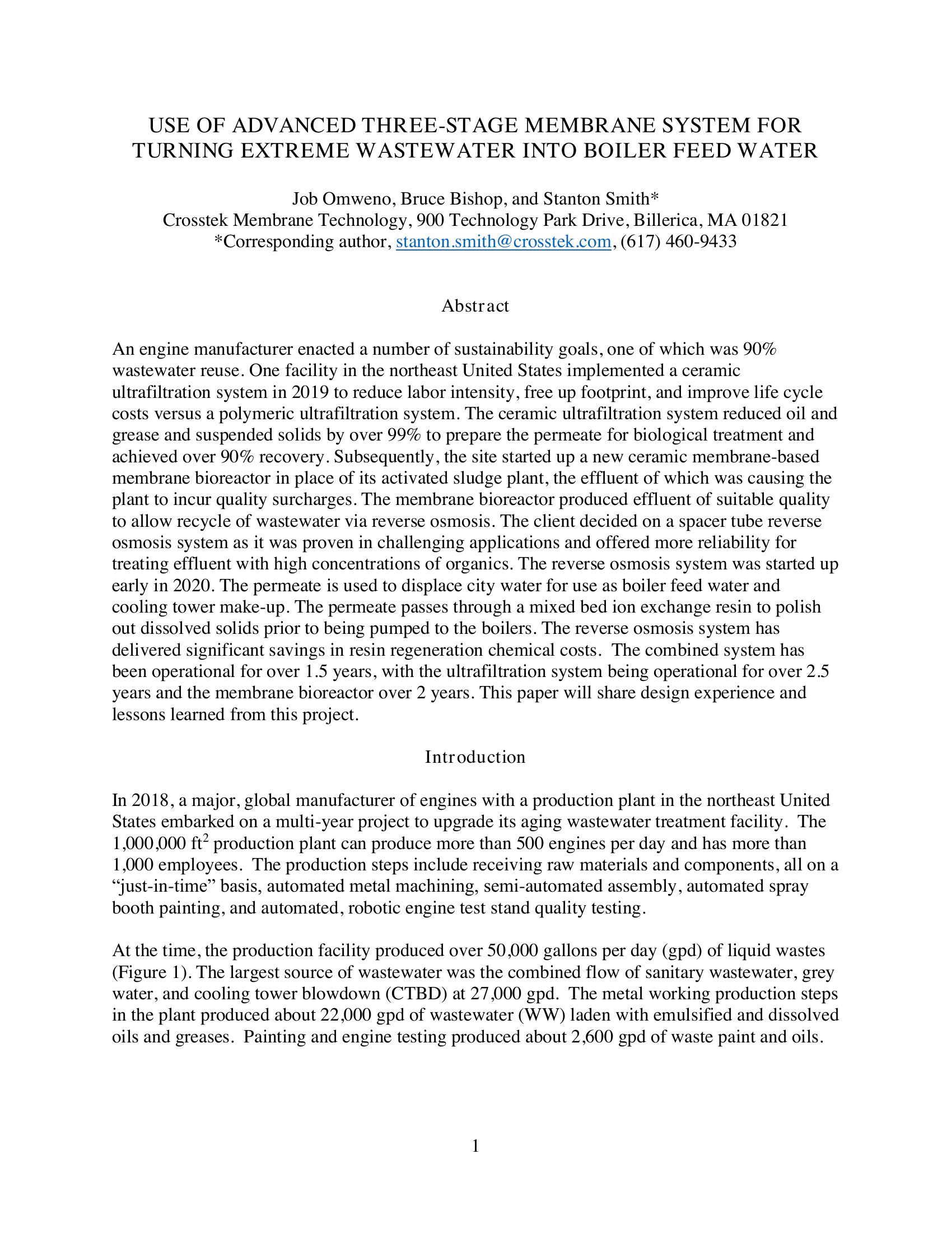 An engine manufacturer enacted a number of sustainability goals, one of which was 90% wastewater reuse. One facility in the northeast United States implemented a ceramic ultrafiltration system in 2019 to reduce labor intensity, free up footprint, and improve life cycle costs versus a polymeric ultrafiltration system. The ceramic ultrafiltration system reduced oil and grease and suspended solids by over 99% to prepare the permeate for biological treatment and achieved over 90% recovery. Subsequently, the site started up a new ceramic membrane-based membrane bioreactor in place of its activated sludge plant, the effluent of which was causing the plant to incur quality surcharges. The membrane bioreactor produced effluent of suitable quality to allow recycle of wastewater via reverse osmosis. The client decided on a spacer tube reverse osmosis system as it was proven in challenging applications and offered more reliability for treating effluent with high concentrations of organics. The reverse osmosis system was started up early in 2020. The permeate is used to displace city water for use as boiler feed water and cooling tower make-up. The permeate passes through a mixed bed ion exchange resin to polish out dissolved solids prior to being pumped to the boilers. The reverse osmosis system has delivered significant savings in resin regeneration chemical costs. The combined system has been operational for over 1.5 years, with the ultrafiltration system being operational for over 2.5 years and the membrane bioreactor over 2 years. This paper will share design experience and lessons learned from this project.
