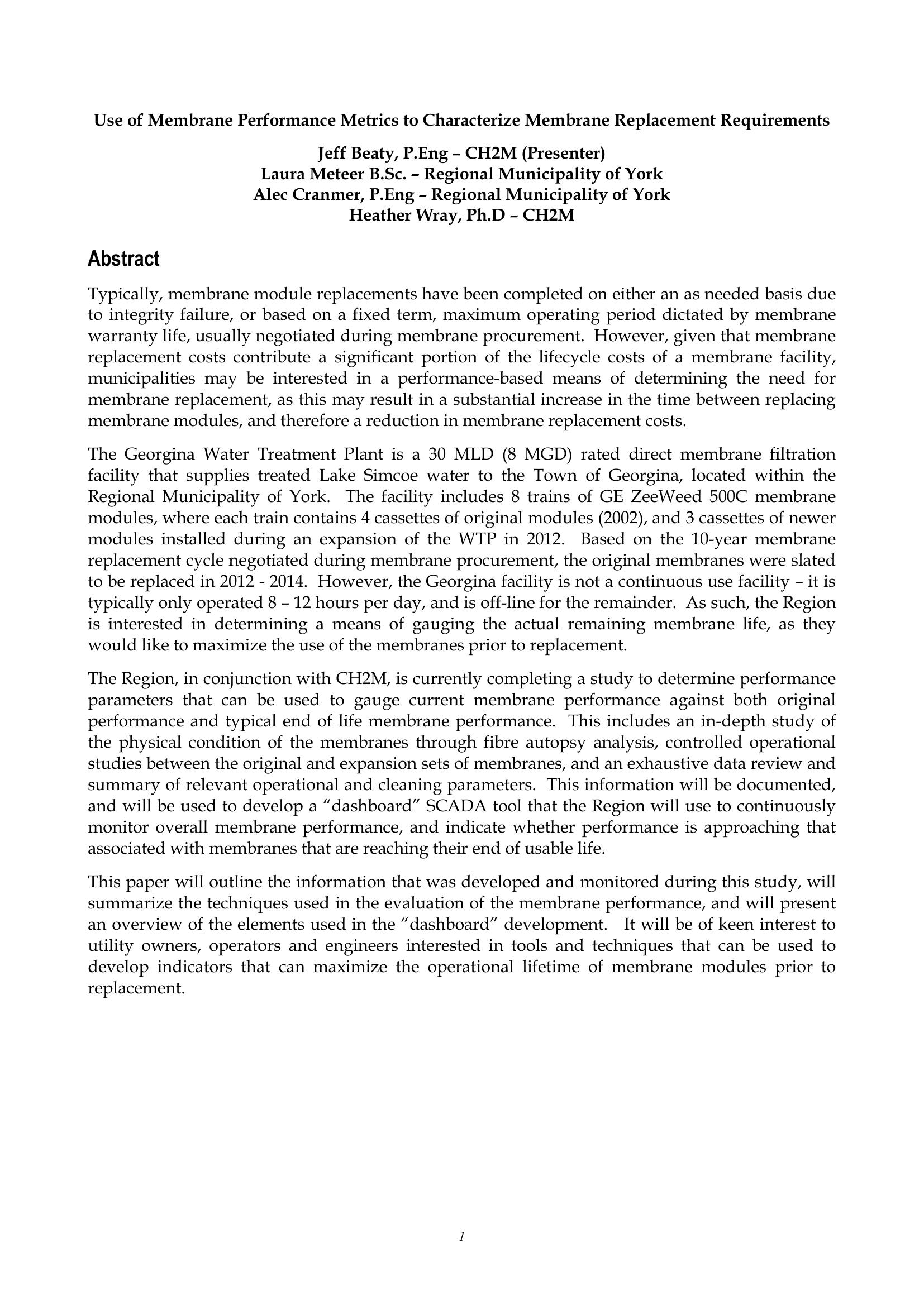 Typically, membrane module replacements have been completed on either an as needed basis due to integrity failure, or based on a fixed term, maximum operating period dictated by membrane warranty life, usually negotiated during membrane procurement. However, given that membrane replacement costs contribute a significant portion of the lifecycle costs of a membrane facility, municipalities may be interested in a performance-based means of determining the need for membrane replacement, as this may result in a substantial increase in the time between replacing membrane modules, and therefore a reduction in membrane replacement costs. The Georgina Water Treatment Plant is a 30 MLD (8 MGD) rated direct membrane filtration facility that supplies treated Lake Simcoe water to the Town of Georgina, located within the Regional Municipality of York. The facility includes 8 trains of GE ZeeWeed 500C membrane modules, where each train contains 4 cassettes of original modules (2002), and 3 cassettes of newer modules installed during an expansion of the WTP in 2012. Based on the 10-year membrane replacement cycle negotiated during membrane procurement, the original membranes were slated to be replaced in 2012 – 2014. However, the Georgina facility is not a continuous use facility – it is typically only operated 8 – 12 hours per day, and is off-line for the remainder. As such, the Region is interested in determining a means of gauging the actual remaining membrane life, as they would like to maximize the use of the membranes prior to replacement. The Region, in conjunction with CH2M, is currently completing a study to determine performance parameters that can be used to gauge current membrane performance against both original performance and typical end of life membrane performance. This includes an in-depth study of the physical condition of the membranes through fibre autopsy analysis, controlled operational studies between the original and expansion sets of membranes, and an exhaustive data review and summary of relevant operational and cleaning parameters. This information will be documented, and will be used to develop a “dashboard” SCADA tool that the Region will use to continuously monitor overall membrane performance, and indicate whether performance is approaching that associated with membranes that are reaching their end of usable life. This paper will outline the information that was developed and monitored during this study, will summarize the techniques used in the evaluation of the membrane performance, and will present an overview of the elements used in the “dashboard” development. It will be of keen interest to utility owners, operators and engineers interested in tools and techniques that can be used to develop indicators that can maximize the operational lifetime of membrane modules prior to replacement.