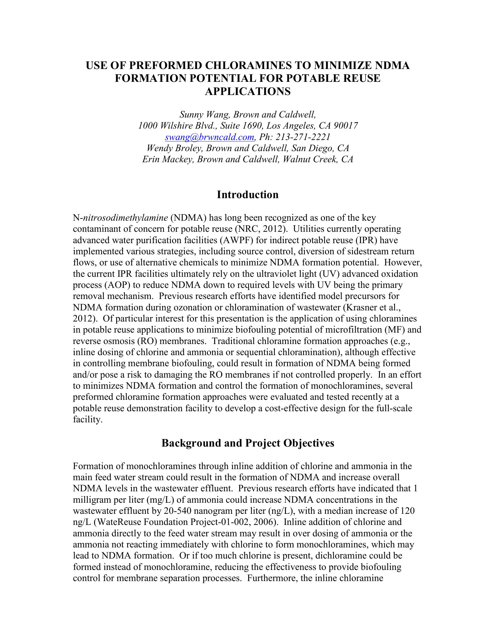 Use of Preformed Chloramines to Minimize NDMA Formation Potential for Potable Reuse APPLICATIONS