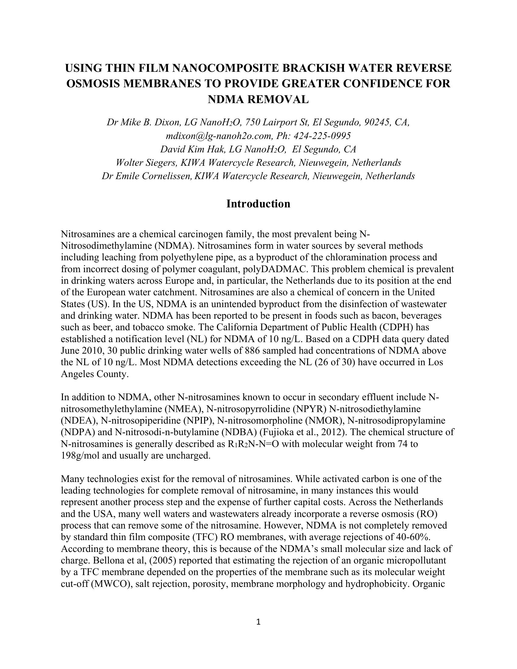 Using Thin Film Nanocomposite (TFN) Brackish Water Reverse Osmosis Membranes to Provide Greater Confidence for NDMA Removal