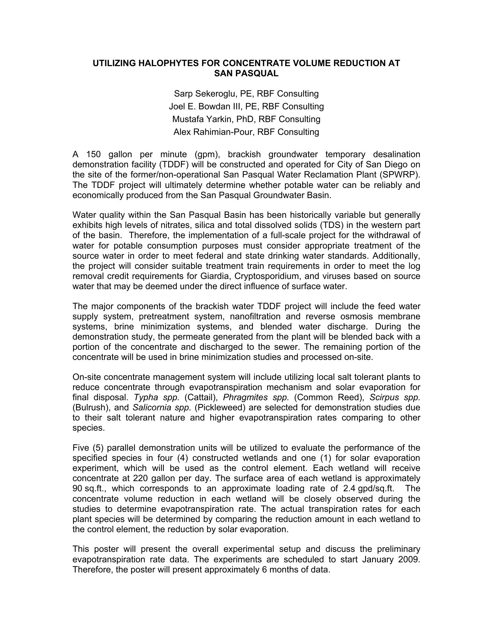Utilizing Halophytes for Concentrate Volume Reduction at San Pasqual
