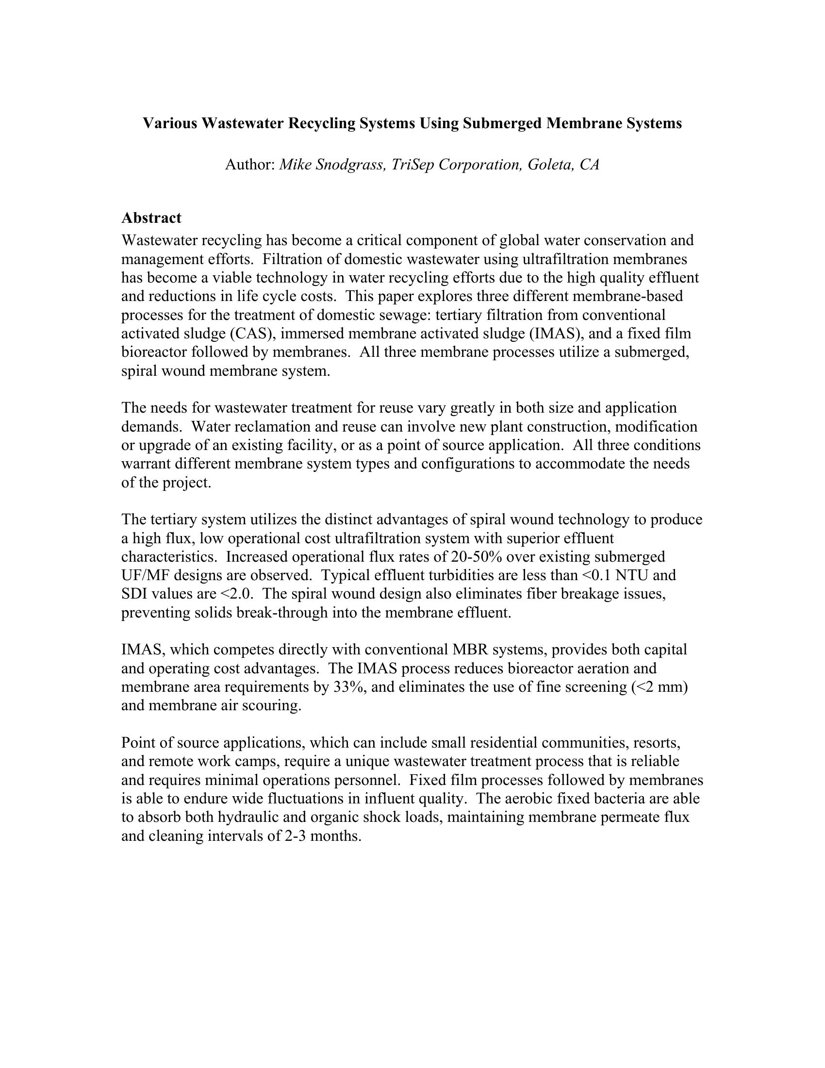 This paper explores three different membrane-based processes for the treatment of domestic wastewater tertiary filtration from conventional activated sludge (CAS), immersed membrane activated sludge (IMAS), and a fixed film bioreactor followed by membranes. All three membrane processes utilize a submerged, spiral wound membrane system. The unique characteristics of the spiral wound membrane design allow for improved performance and cost reductions over existing hollow fiber formats.