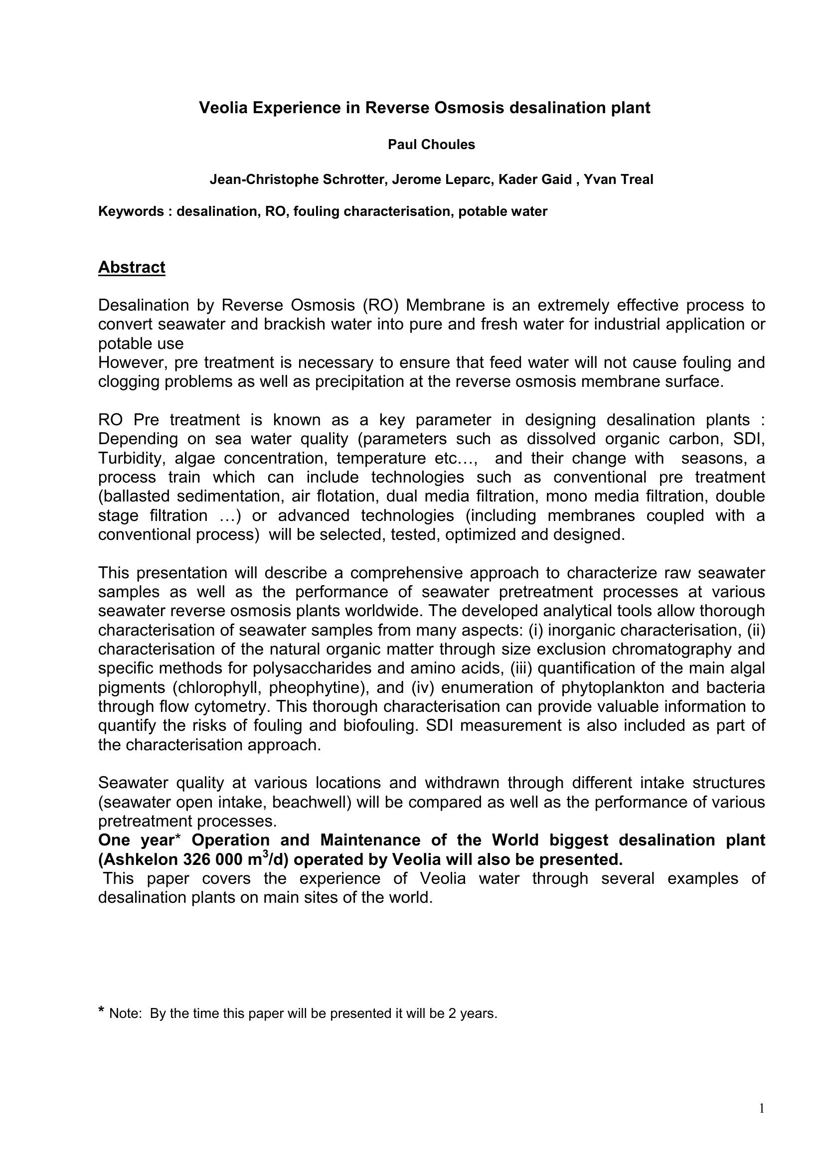 Veolia Experience in Reverse Osmosis Desalination Plant