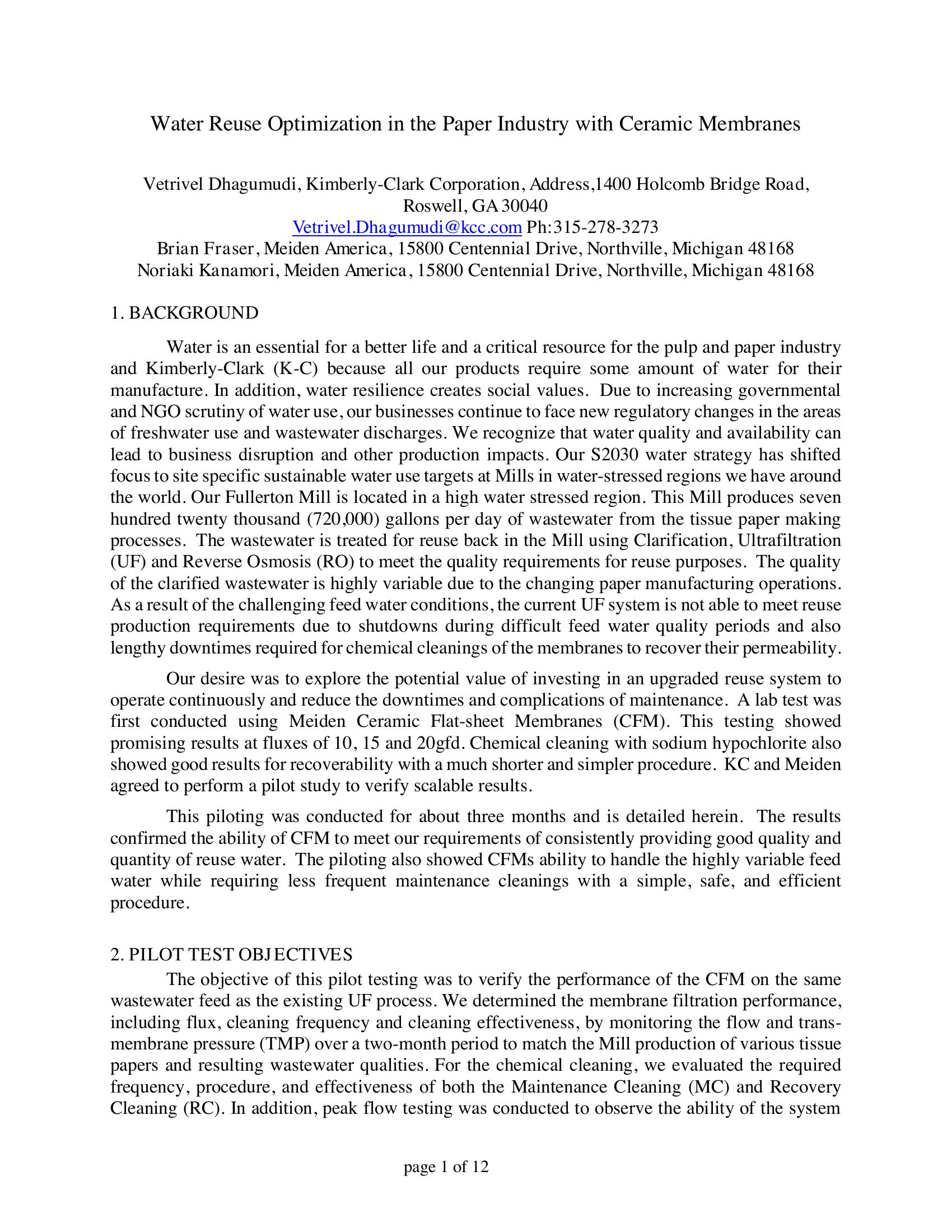 Water is an essential for a better life and a critical resource for the pulp and paper industry and Kimberly-Clark (K-C) because all our products require some amount of water for their manufacture. In addition, water resilience creates social values. Due to increasing governmental and NGO scrutiny of water use, our businesses continue to face new regulatory changes in the areas of freshwater use and wastewater discharges. We recognize that water quality and availability can lead to business disruption and other production impacts. Our S2030 water strategy has shifted focus to site specific sustainable water use targets at Mills in water-stressed regions we have around the world. Our Fullerton Mill is located in a high water stressed region. This Mill produces seven hundred twenty thousand (720,000) gallons per day of wastewater from the tissue paper making processes. The wastewater is treated for reuse back in the Mill using Clarification, Ultrafiltration (UF) and Reverse Osmosis (RO) to meet the quality requirements for reuse purposes. The quality of the clarified wastewater is highly variable due to the changing paper manufacturing operations. As a result of the challenging feed water conditions, the current UF system is not able to meet reuse production requirements due to shutdowns during difficult feed water quality periods and also lengthy downtimes required for chemical cleanings of the membranes to recover their permeability.