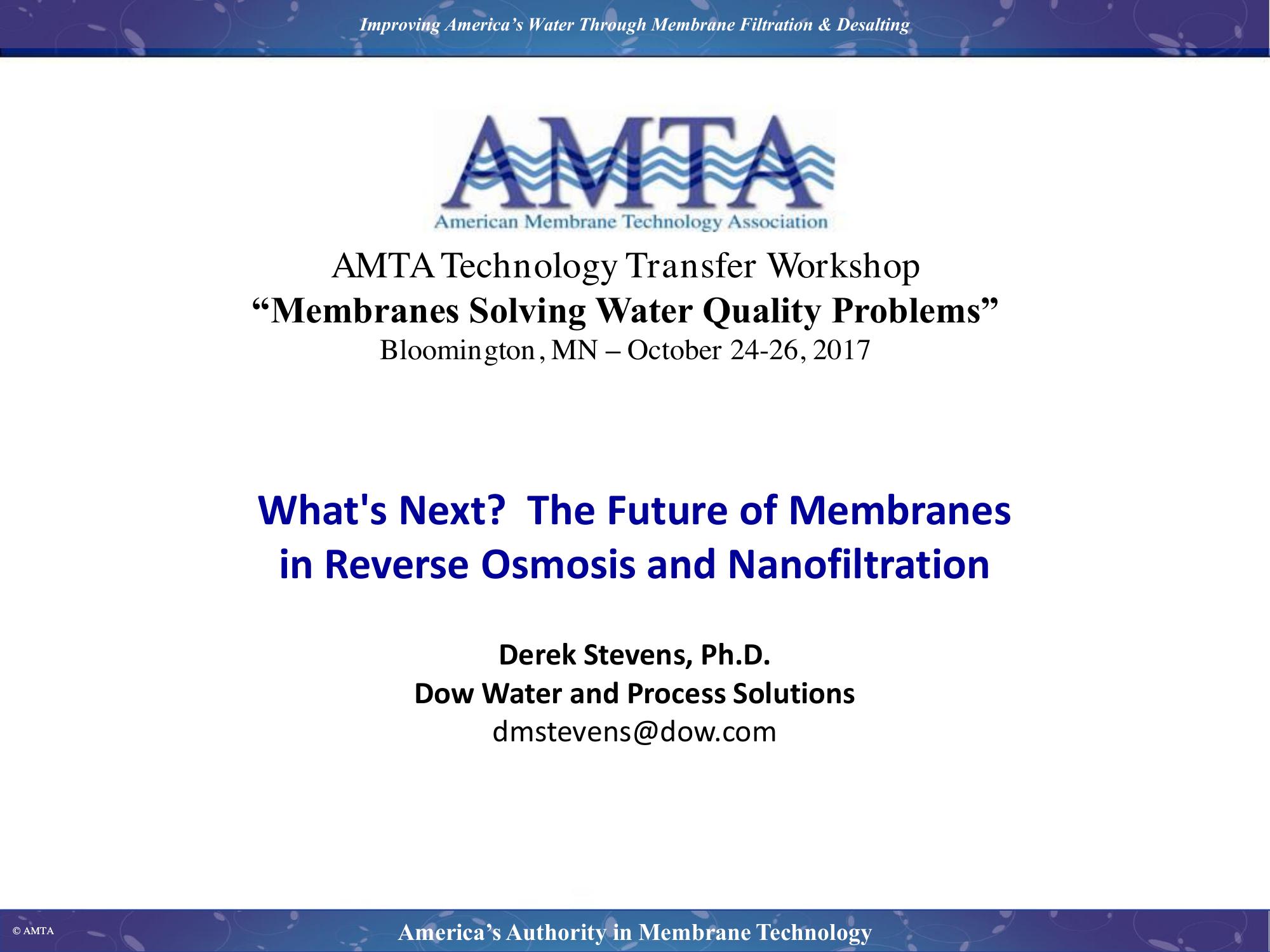 Advancements in technology and manufacturing have brought reverse osmosis and nanofiltration membranes to the forefront in many of today’s filtration processes. New technologies and applications promise to expand this role even futher. In this talk, we provide a perspective on the future challenges and applications for membrane filtration and the role new membrane technologies may play.