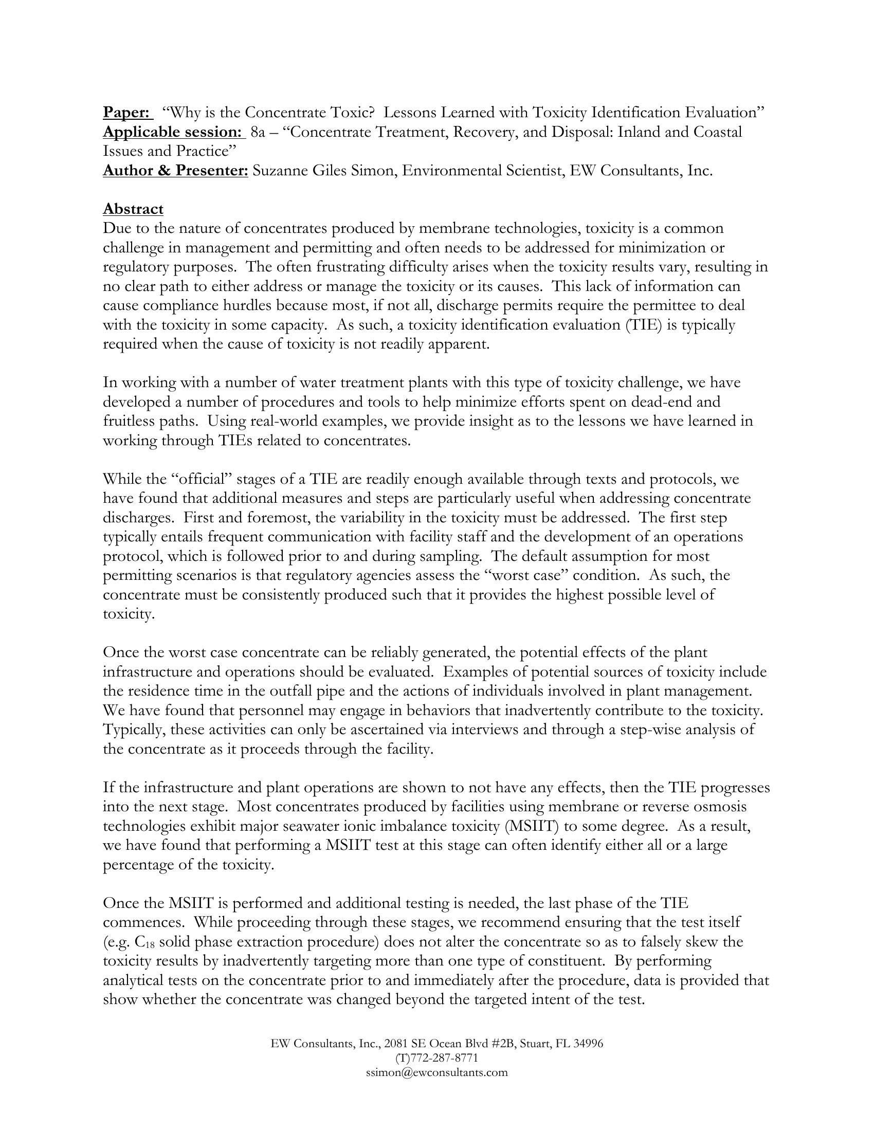 The goal of this paper is to give an overview of the Toxicity Identification Evaluation process for facilities utilizing membrane technologies and to provide some practical guidance on how to make it as efficient as possible, thereby saving time, resources, and frustration.